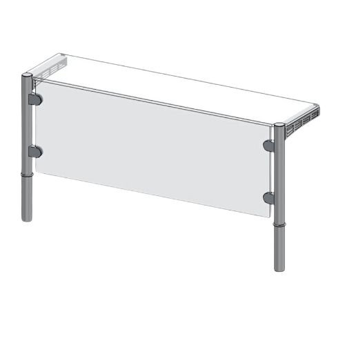Rozsdamentes acélból készült egyszintes átadó polc. A polc 10 mm-es edzettüveg, a függőleges leheletvédő 8 mm-es üveg. Ø40-es lábakkal és rejtett rögzítéssel.