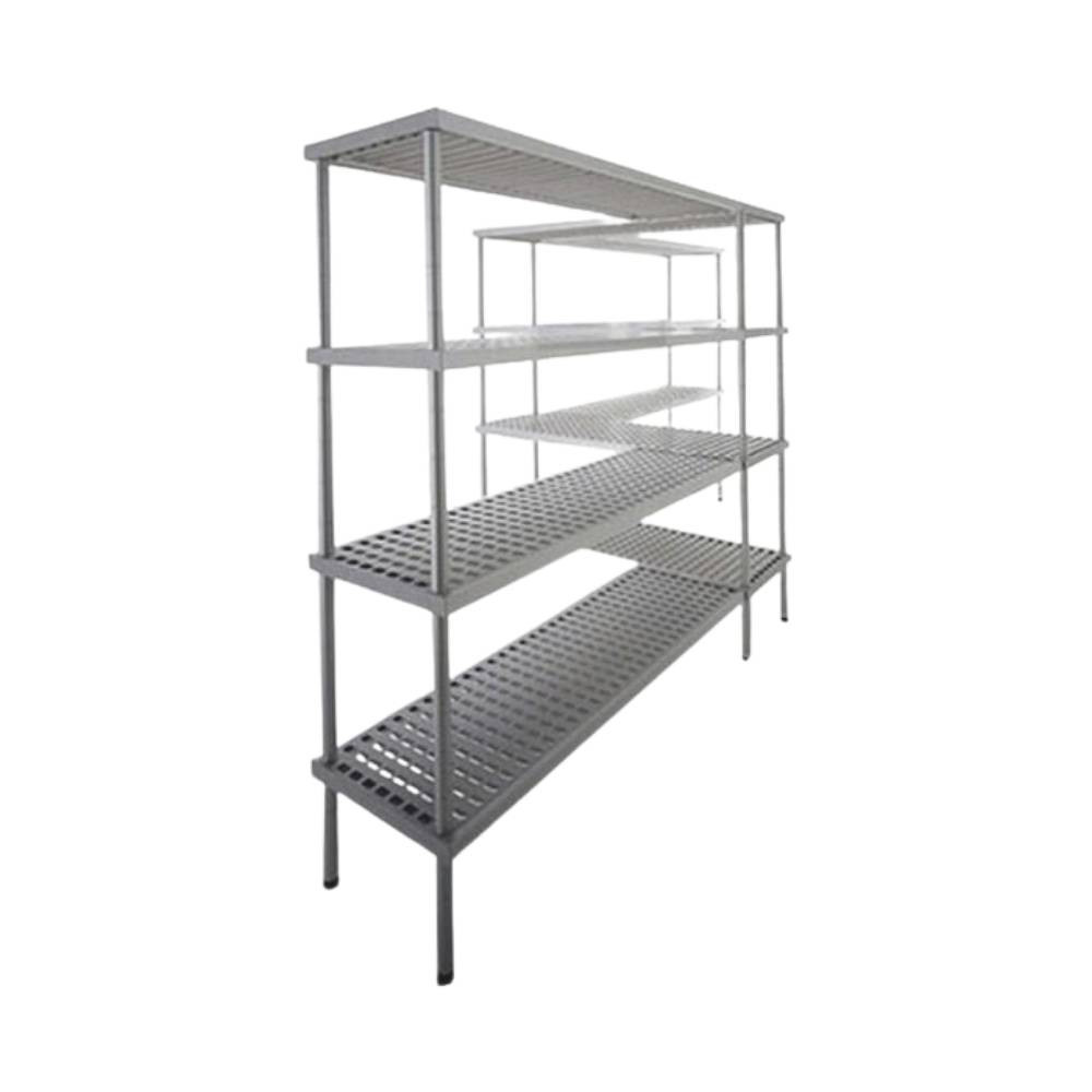 Aluplast tároló állvány ipari konyhák részére. Perforált, ipari mosogatógépben is mosható polcbetétekkel. A polcok magassága 10 cm-enként állítható, maximális terhelhetőségük 150 kg. A polcok anyaga polietilén, a lábak és keresztmerevítők alumíniumból készültek.