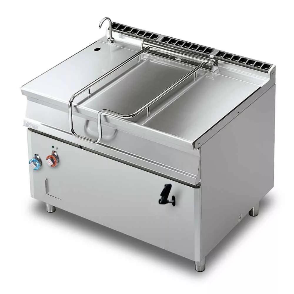 Olaszországban gyártott, nagykonyhai használatra tervezett elektromos billenő serpenyő berendezés, rozsdamentes acélból, főzősorba illeszthető kivitelben.
