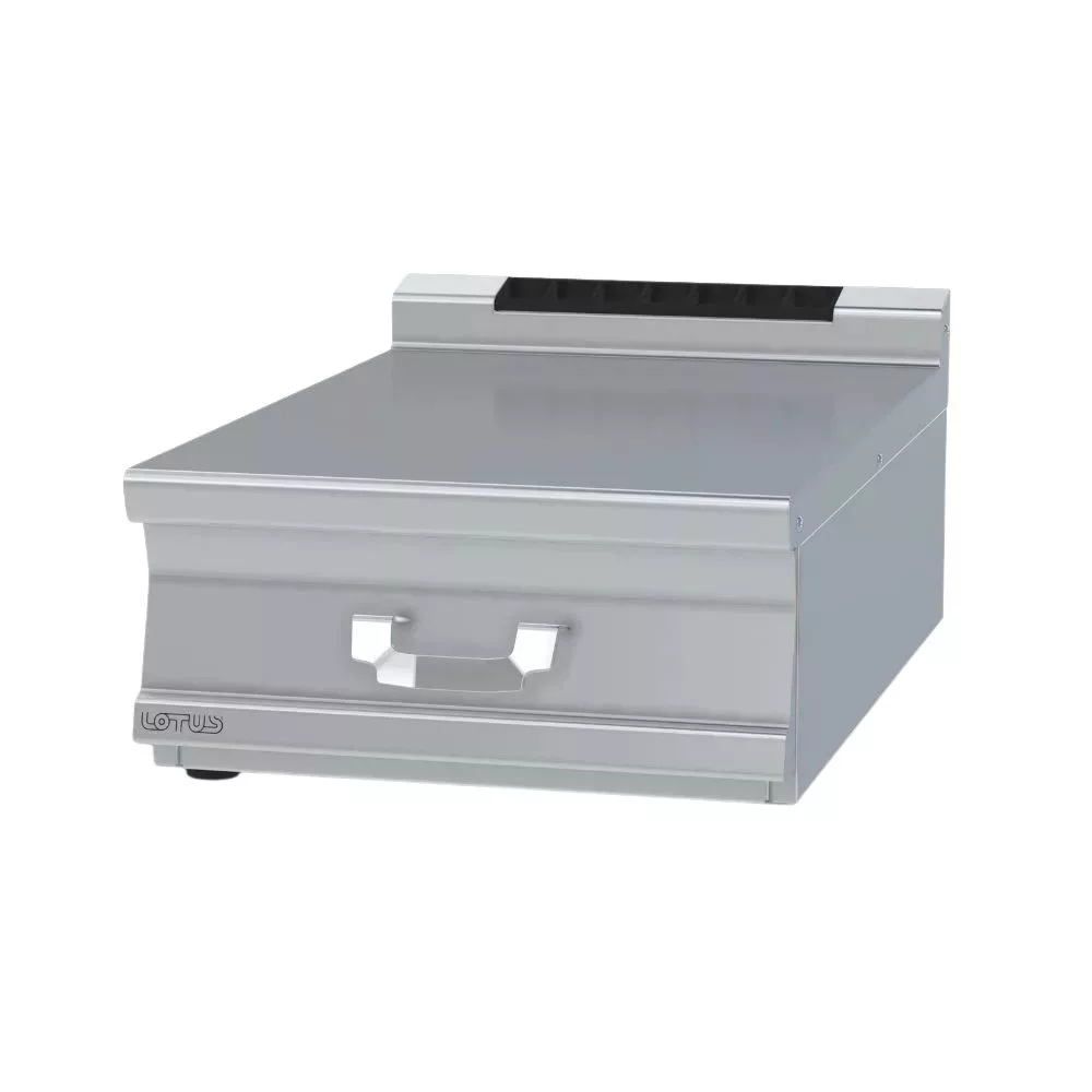 Olaszországban gyártott, rozsdamentes acélból készült blokk munkaasztal, 2 mm vastag, zajtompított munkafelülettel, állítható lábakkal. Hátsó felhajtással, lekerekített szélekkel, 1 db fiókkal rendelkezik. Ennek mérete: 49,5x50x15 cm.