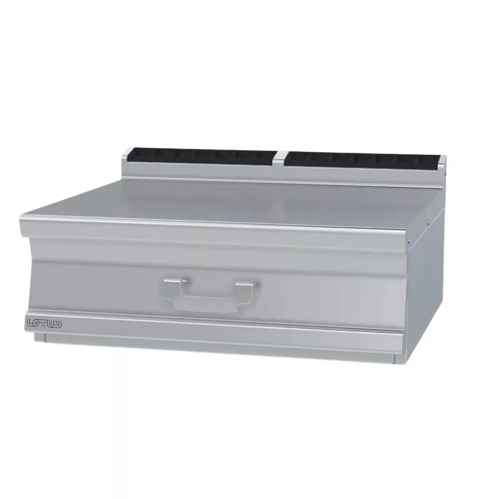 Olaszországban gyártott, rozsdamentes acélból készült blokk munkaasztal, 2 mm vastag, zajtompított munkafelülettel, állítható lábakkal. Hátsó felhajtással, lekerekített szélekkel és 1 db fiókkal rendelkezik. A belső műanyag tároló mérete: 2 x GN1/1.