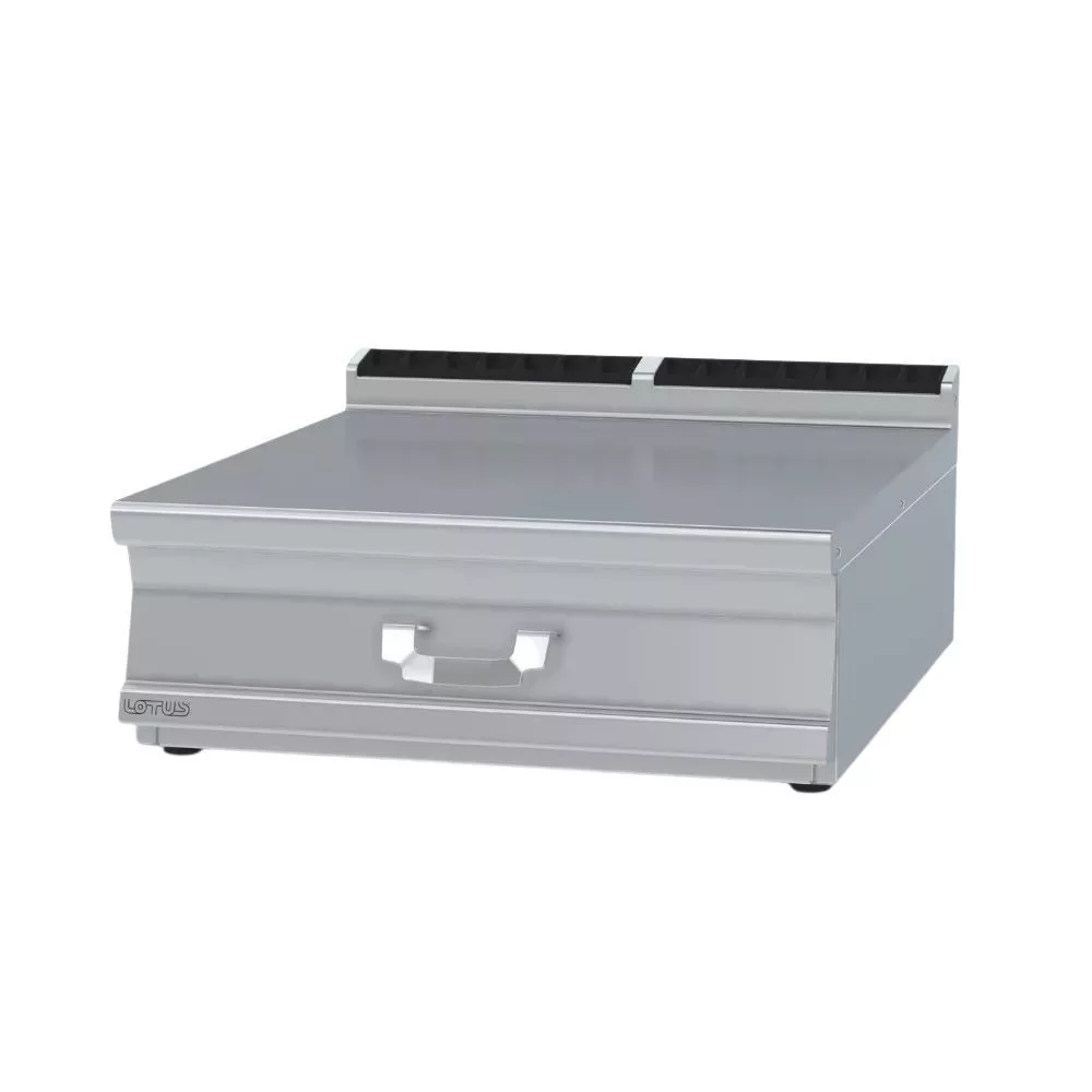 Olaszországban gyártott, rozsdamentes acélból készült blokk munkaasztal, 2 mm vastag, zajtompított munkafelülettel, állítható lábakkal. Hátsó felhajtással, lekerekített szélekkel, 1 db fiókkal rendelkezik. A műanyag tároló mérete: 2 x GN1/1.