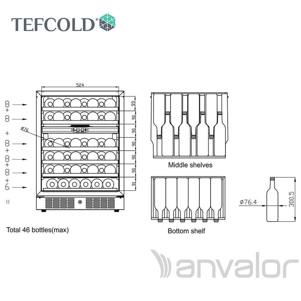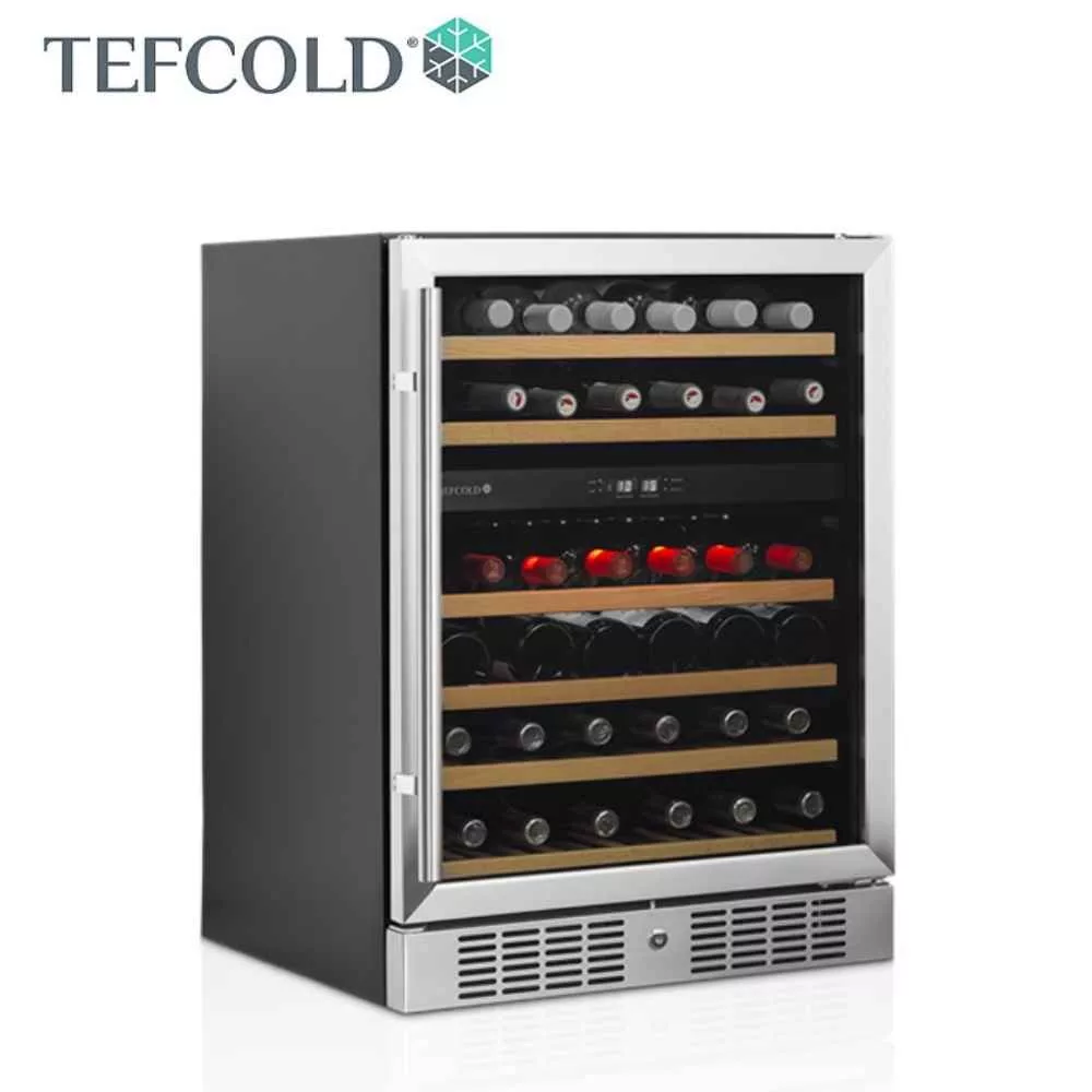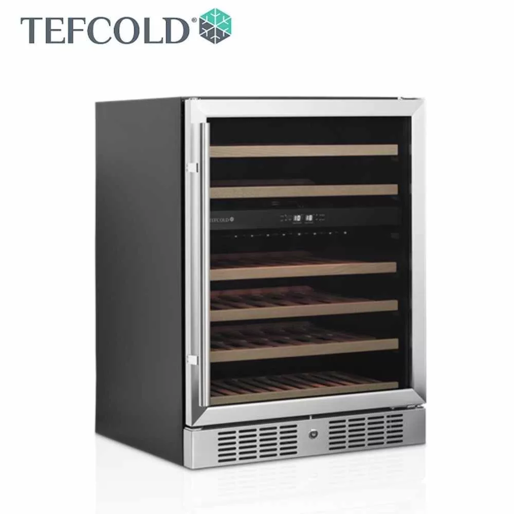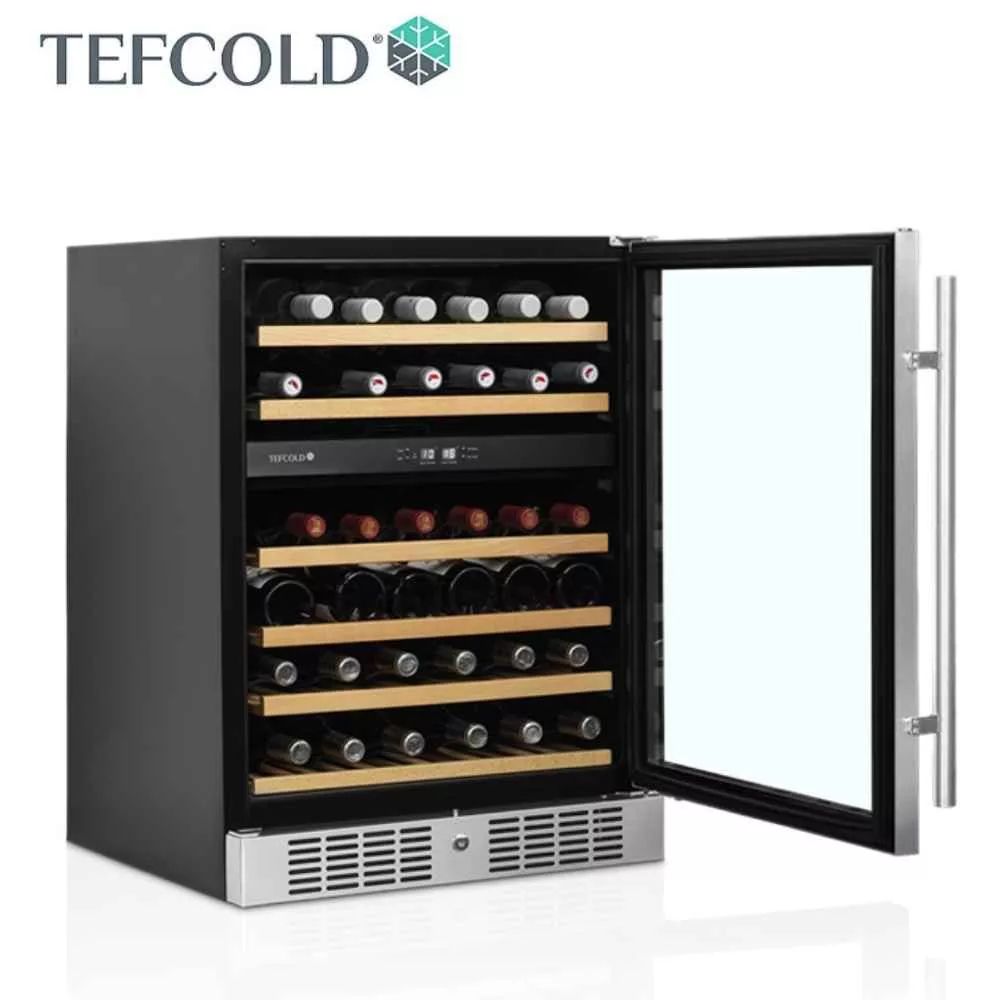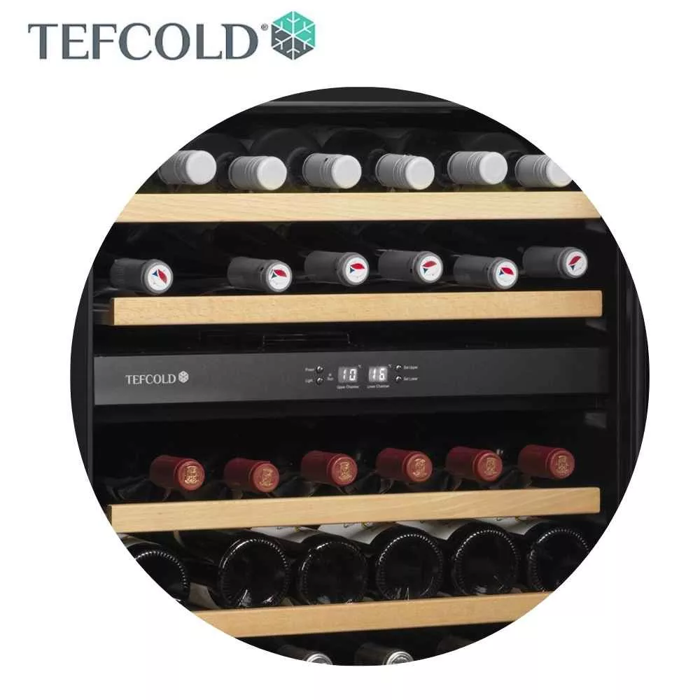 Kihúzható fa borospolcokkal, LED világítással, 155 literes űrtartalommal (Nettó: 131 liter), 2 hőmérsékleti zónával.