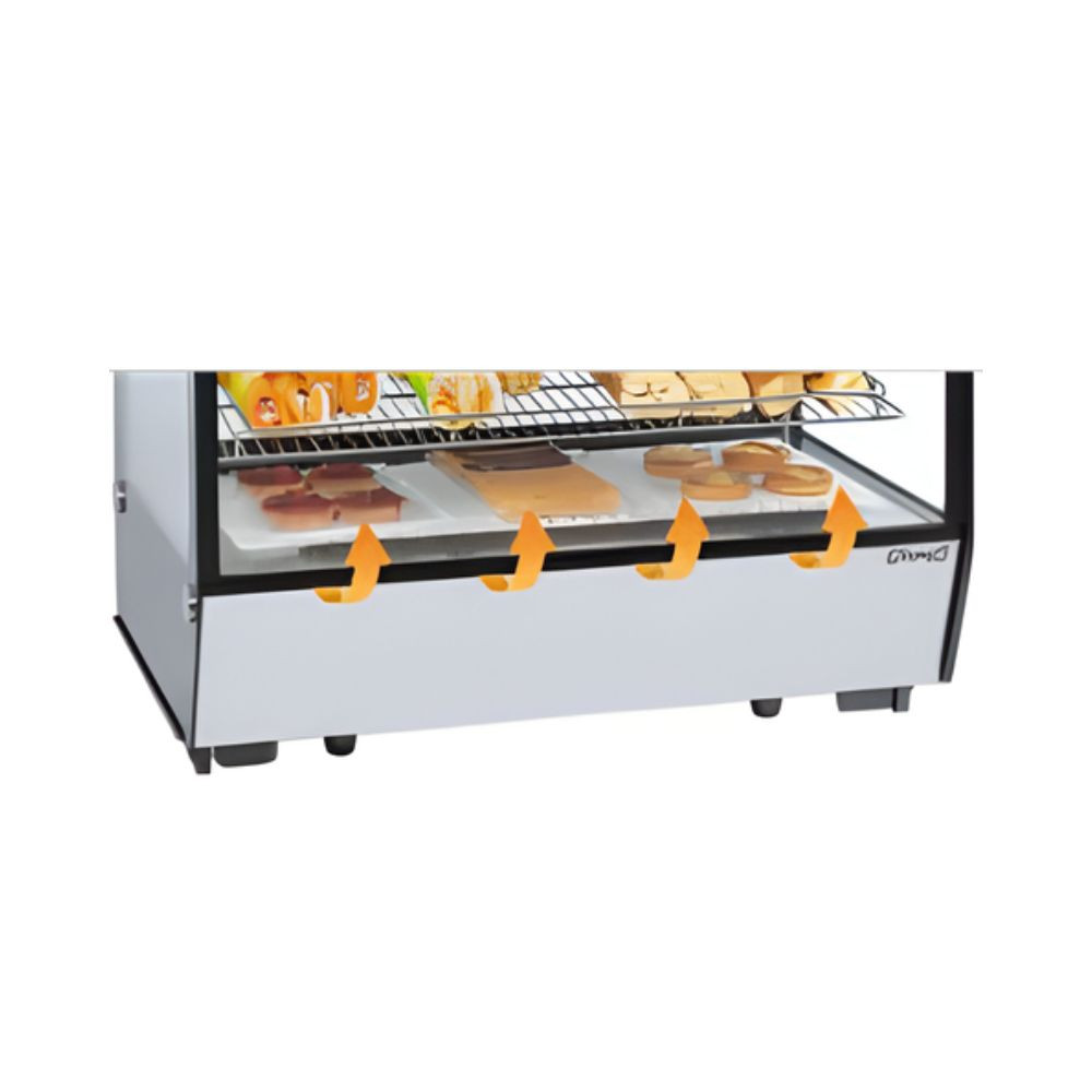 A készülék ventilált hűtőrendszerrel, két ventilátorral működik, ami segíti az egyenletes belső hőmérséklet fenntartását. Az automatikus leolvasztás megkönnyíti a napi üzemeltetést, míg a 2–12 °C közötti hőmérséklet-tartomány sokféle hűtött termék tárolását és bemutatását teszi lehetővé. A vitrin 145 literes kapacitással rendelkezik, és 3 állítható polccal van felszerelve, így a belső tér rugalmasan alakítható az aktuális kínálathoz. A termékek hátoldalról tölthetők be, ami kényelmes és praktikus használatot biztosít kiszolgálás közben is.