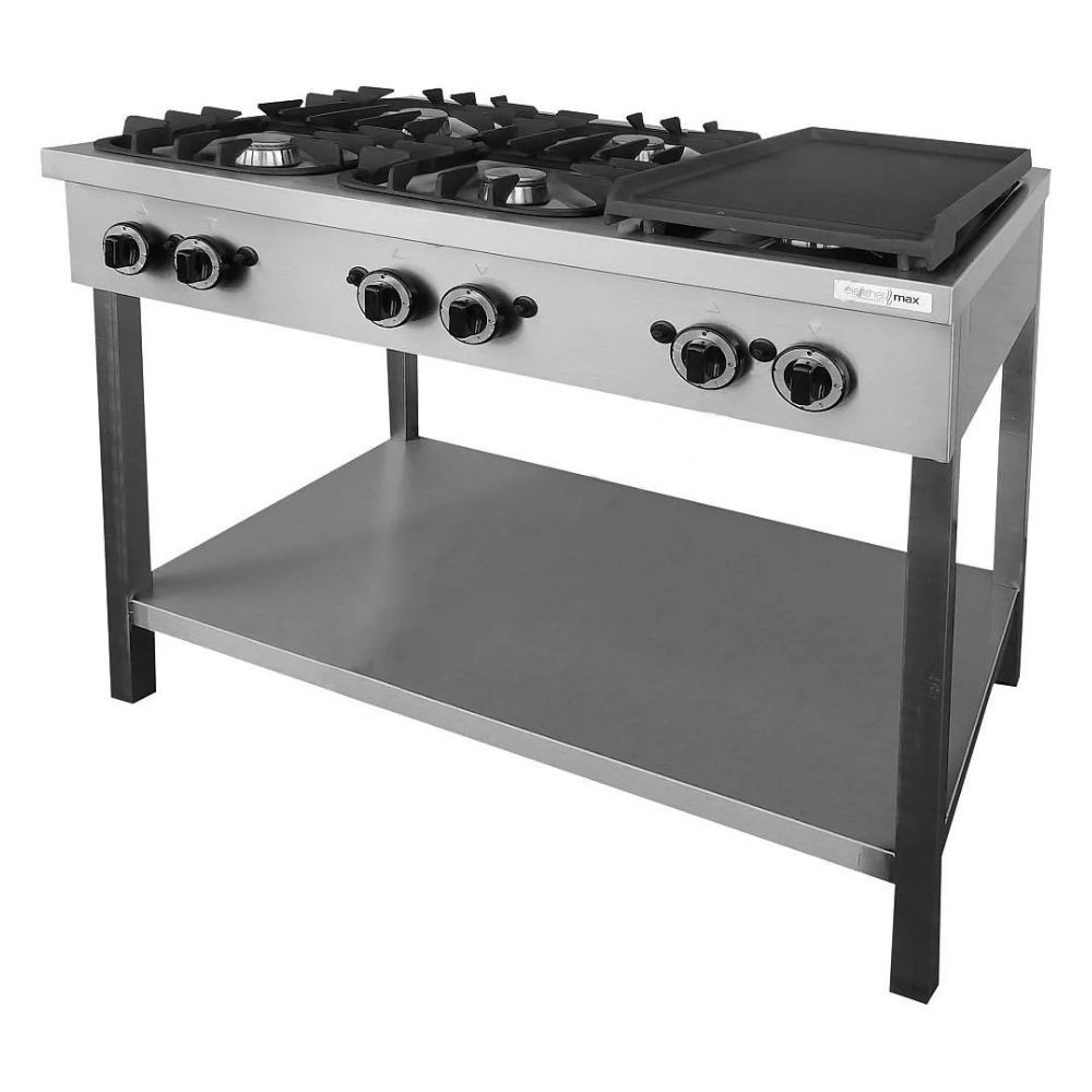 - Hatékony működés – A 22,2 kW összteljesítményű gázüzemű tűzhely és rostlap gyorsan felmelegszik, így kiválóan alkalmas húsok, tojásételek, zöldségek vagy palacsinta elkészítéséhez.