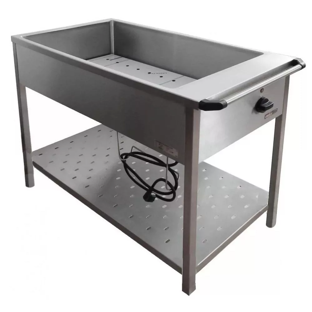 Magyarországon gyártott, vízfürdős melegentartó, 2xGN1/1 edényzet férőhellyel, alsó polccal. Rozsdamentes acél kivitel, alsó tároló polccal. A medencébe töltött vizet csőfűtőtest melegíti, a víz a medence alatt található csap segítségével leereszthető. Hőfokszabályozás tekerőgombbal (30-93°C).