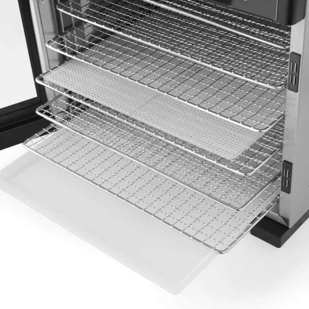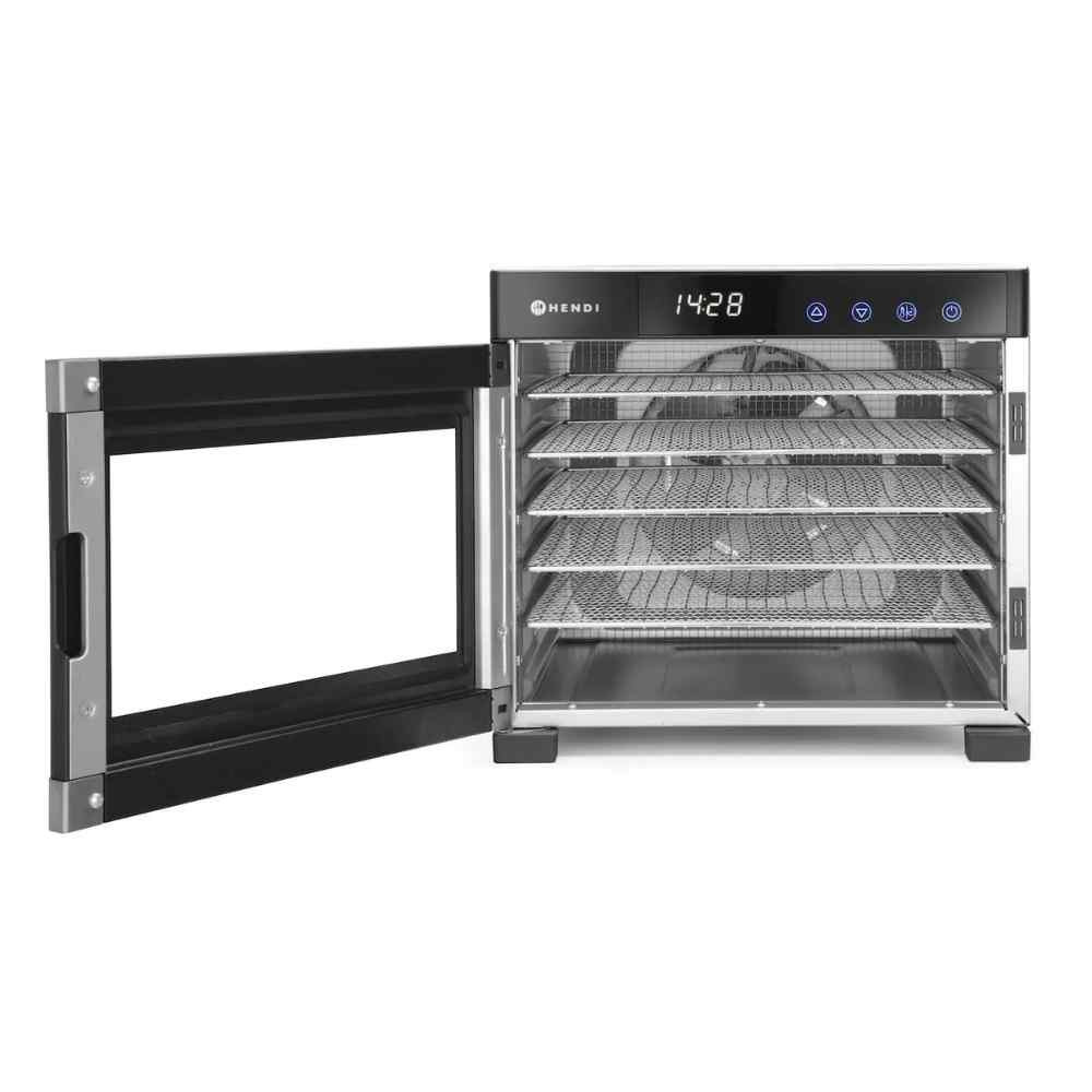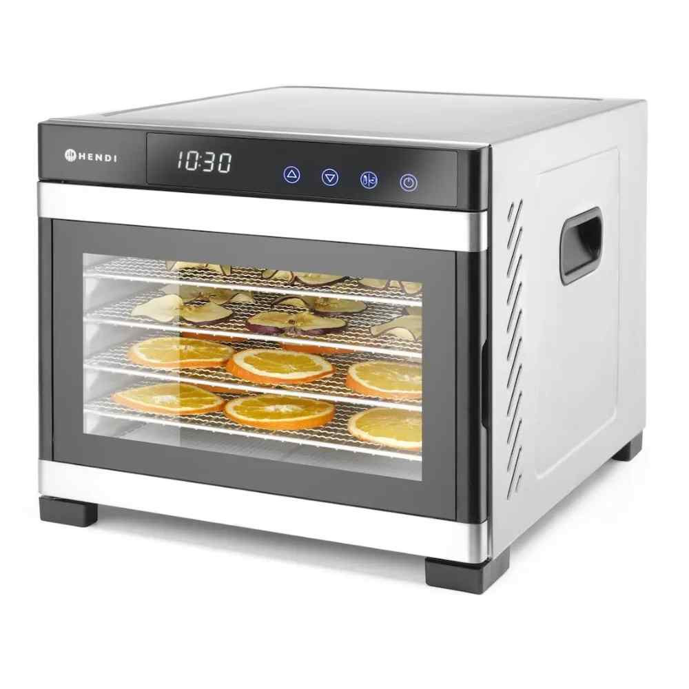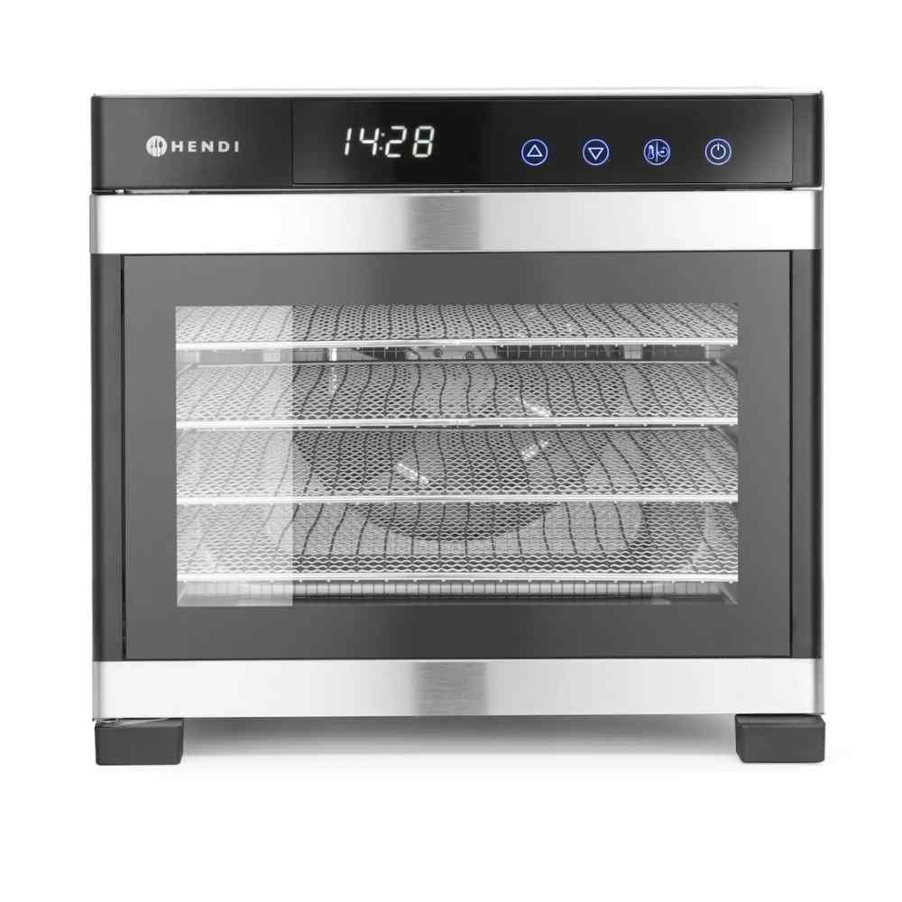 A Hendi Profi Aszalógép 6 tálcás: Rozsdamentes acél készülékház. Ideális gyümölcsök, zöldségek, gyógynövények, húsok, halak stb. szárításához. Digitális vezérlőpanel, 30 perces fokozatonként állítható időzítő (max. 24 óra) és hőmérséklet-szabályozás 35°C és 75°C között, 5°C-os lépésekben. Csendes ventilátorok biztosítják az egyenletes meleg levegő keringetését, így a tálcák forgatása nem szükséges. A készülék 6 db 305x330 mm-es rozsdamentes acél tálcával rendelkezik, amelyek azonos távolságra helyezkednek el, könnyen kivehetők és tisztíthatók. Az átlátszó ajtó lehetővé teszi az aszalási folyamat nyomonkövetését.