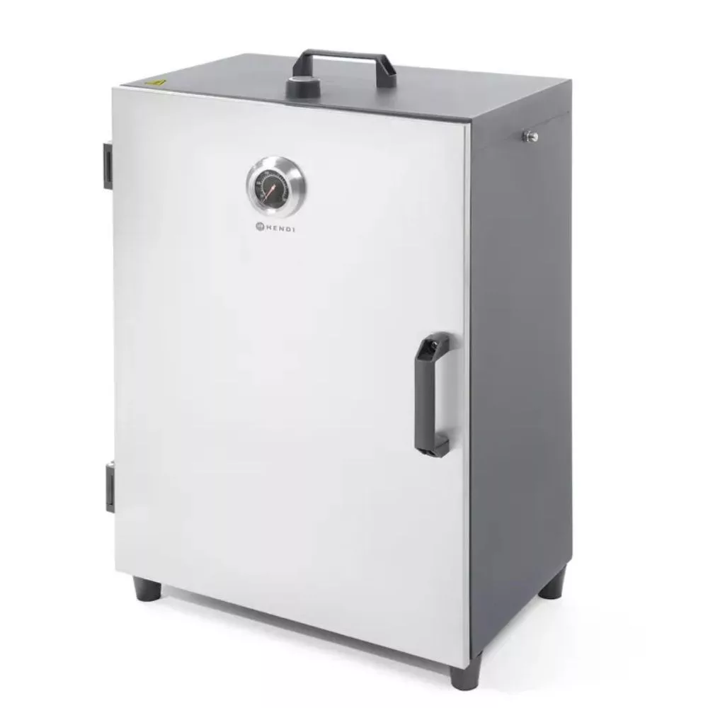 Hendi elektromos füstölő szekrény rozsdamentes acélból, mágnesesen záródó dupla szigeteléssel ellátott ajtóval.