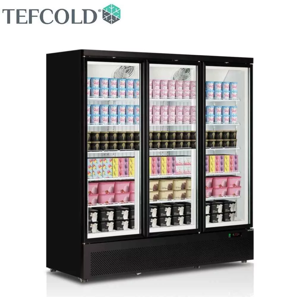 Fagyasztóvitrin, LED belső világítással, állítható polcokkal, 4db görgővel, 3 db önzáródó üvegajtóval, ventilációs hűtéssel.
