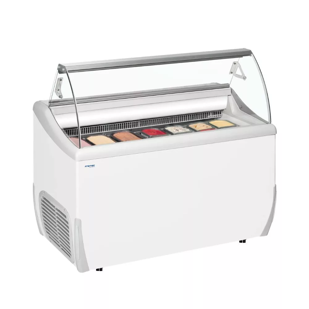 Ez a fagylaltpult elegáns megjelenést és praktikus funkcionalitást egyesít, kifejezetten eladótéri használatra tervezve. A lekerekített élek és a fehérre festett külső-belső felület harmonikus, letisztult látványt adnak, így bármilyen cukrászda vagy fagylaltozó belső terébe könnyen illeszkedik. A beépített LED belső világítás kiemeli a fagylalt színeit, növeli a termékek láthatóságát és vonzóbbá teszi a kínálatot a vásárlók számára.