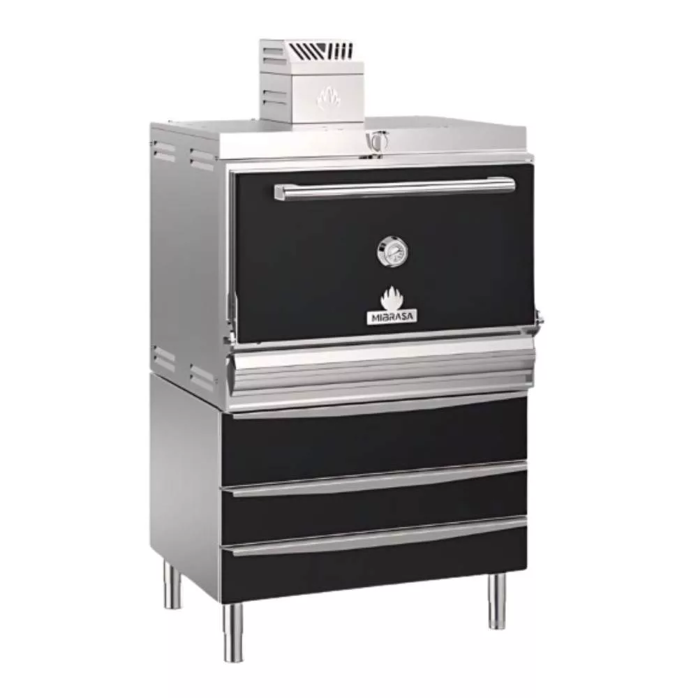 Mibrasa állványos, faszenes sütő, zárt grill. Alsó három fiókos tárolóval, légáramlás szabályzóval. Az alsó fűtött fiókok hőmérséklete egyre alacsonyabb, így egyszerre akár konfitálhatunk, párolhatunk, dehidratálhatunk. Az alsó fiókok hőmérséklete: 90ºC - 65ºC - 55ºC. A felső melegentartó rács hőmérséklete 40-60°C között van, optimalizálva a sütő maradékhőjét. Több színben elérhető, így minden konyhához megtalálható a tökéletes stílus.
