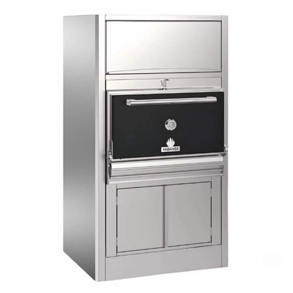 Mibrasa állványos, faszenes sütő, zárt grill. Melegentartó polccal és alsó tárolóval, légáramlás szabályzóval. Alsó és felső fűtött szekrénnyel, az alsó szekrény hőmérséklete 50-70°C között van, a felső polcok pedig 150°C körül, felhasználva a sütő maradékhőjét. Több színben elérhető, így minden konyhához megtalálható a tökéletes stílus.
