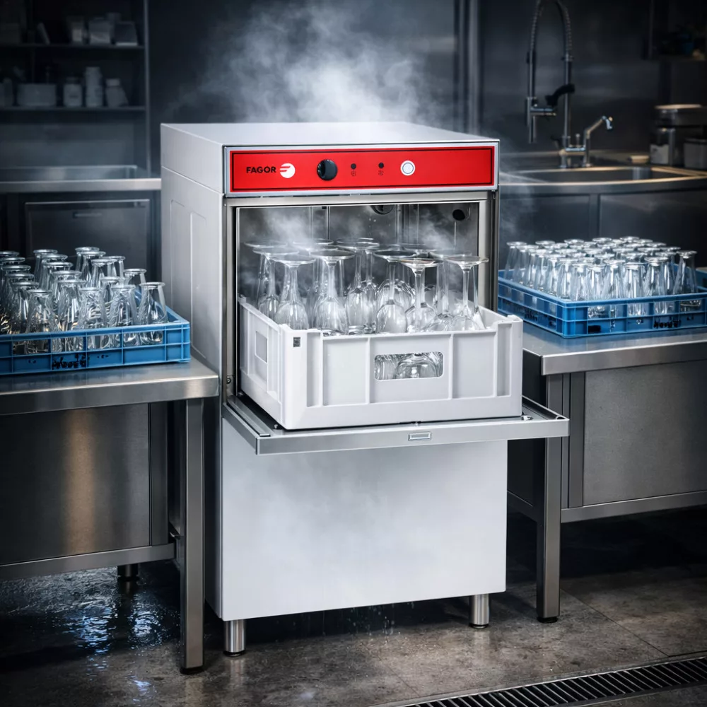 Fagor eco ipari pohármosogató gép, 40x40 cm-es kosár,leeresztő szivattyúval, beépített mosogató öblítő adagolóval