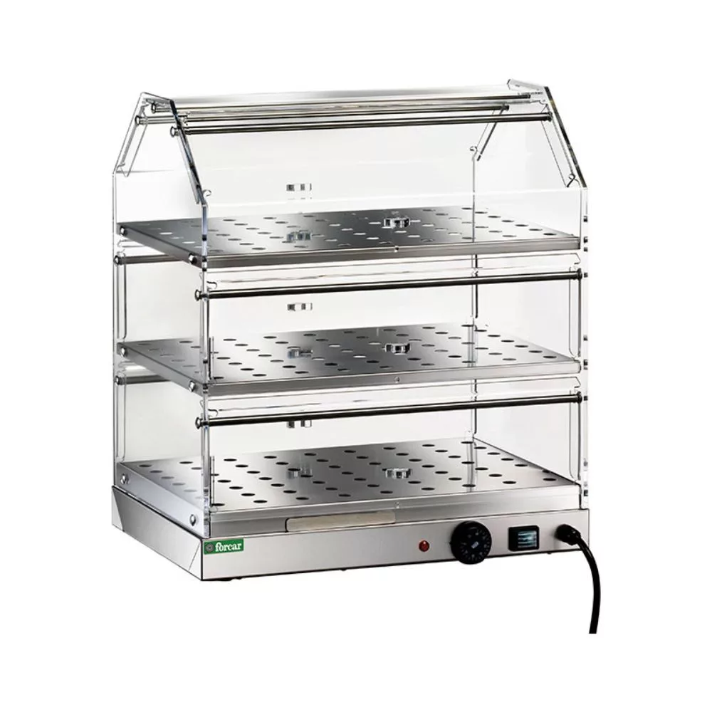 A kompakt, asztalra helyezhető konstrukció könnyen integrálható pultok fölé vagy kis konyhai munkaterületekre, ahol korlátozott a hely. A három szint lehetővé teszi a termékek logikus és jól áttekinthető elrendezését, növelve az eladások esélyét, miközben a karbantartás és tisztítás gyorsan elvégezhető a könnyen hozzáférhető belső felületeknek köszönhetően.