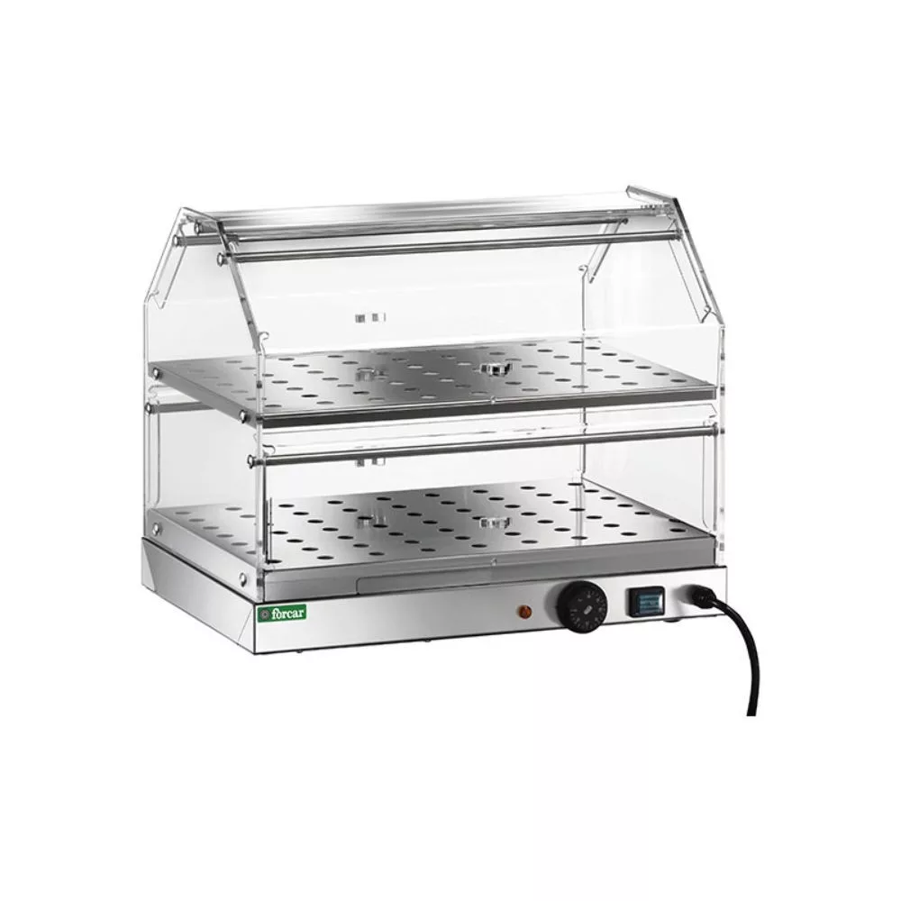 Az Forcar VBR4752 modellje egy magas minőségű melegentartó vitrin, amely AISI 304-es rozsdamentes acél szerkezetből készül, így tartósságban és higiéniai szempontból is kiváló. A két frontoldalon és az oldalfalakon átlátszó plexiüveg biztosítja, hogy az elhelyezett ételek látványosan és vonzóan legyenek bemutatva. A készülék termosztátja állítható tartományban működik, +30 °C-tól egészen +90 °C-ig, így sokféle meleg állagú étel számára ideális. Ezenfelül a beépített párásító rendszer hozzájárul az ételek frissességének és minőségének megőrzéséhez, ami különösen fontos a vendéglátásban. Tökéletes választás bármilyen vendéglátóhely illetve catering egységek számára.