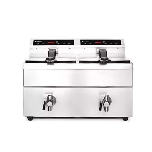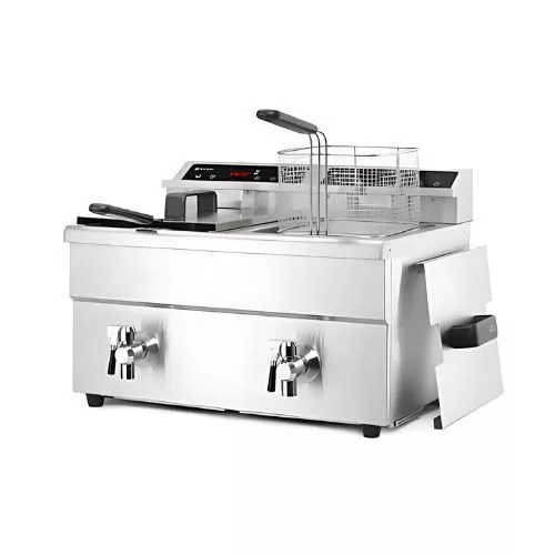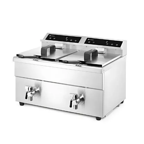 Precíz hőmérsékletszabályozás, indukciós technológia pontosan ugyanazon a hőmérsékleten tartja az olajat. Két darab visszaszámláló időzítővel. Hatékony hőátadás. Rozsdamentes acél ház a könnyen tisztíthatóság érdekében. Túlmelegedés elleni védelem. Az olaj beállított hőmérsékletét kijelző mutatja. Két sütőkosárral és két tetővel.