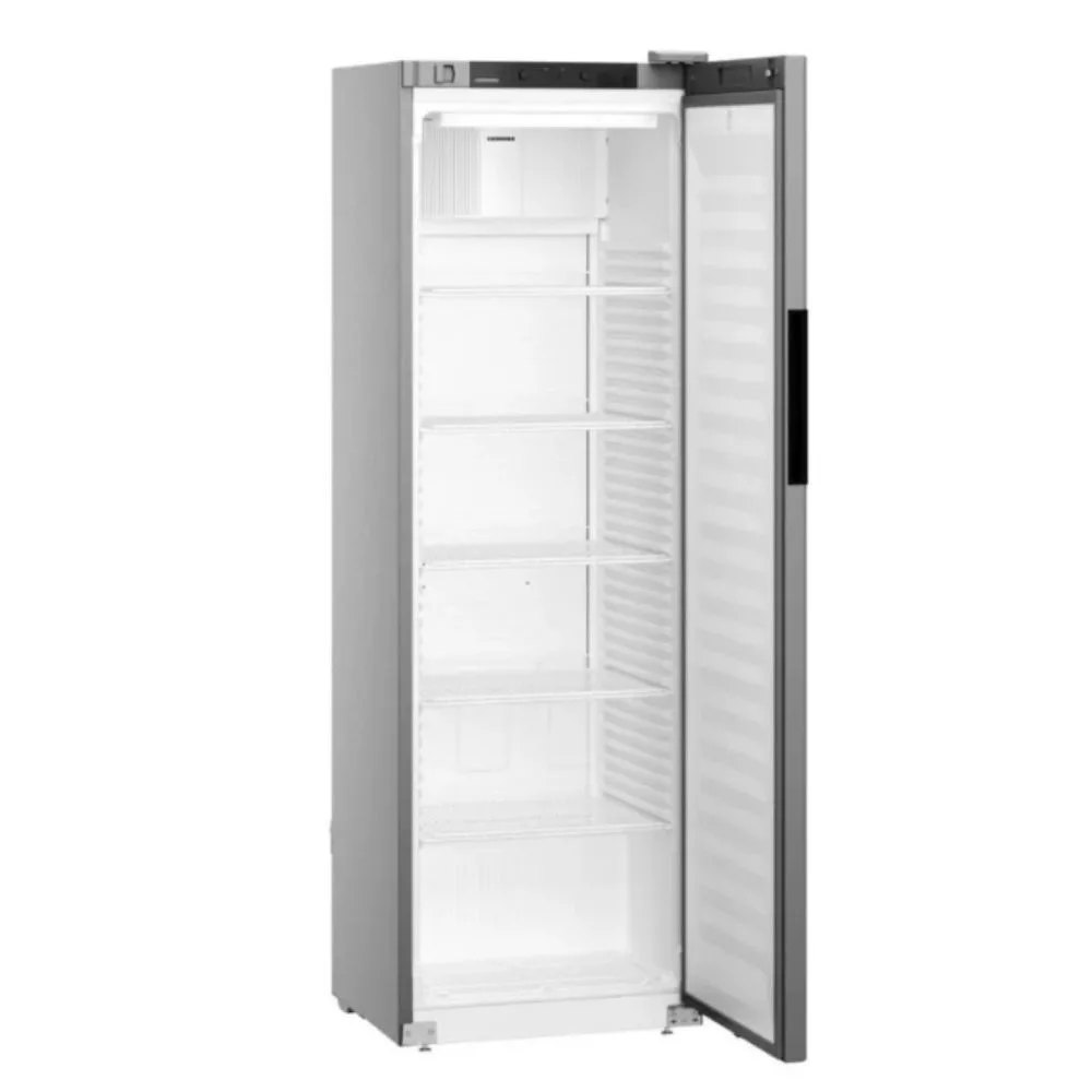 Bruttó 377 literes hűtőszekrény, ventilációs hűtési rendszerrel, zárható HardLine teli ajtóval, szürke színű.