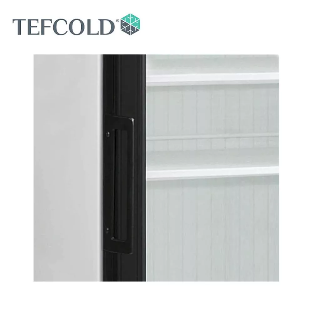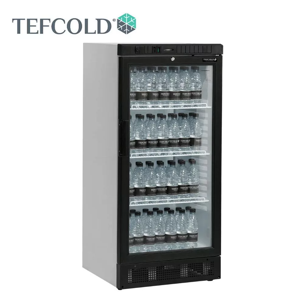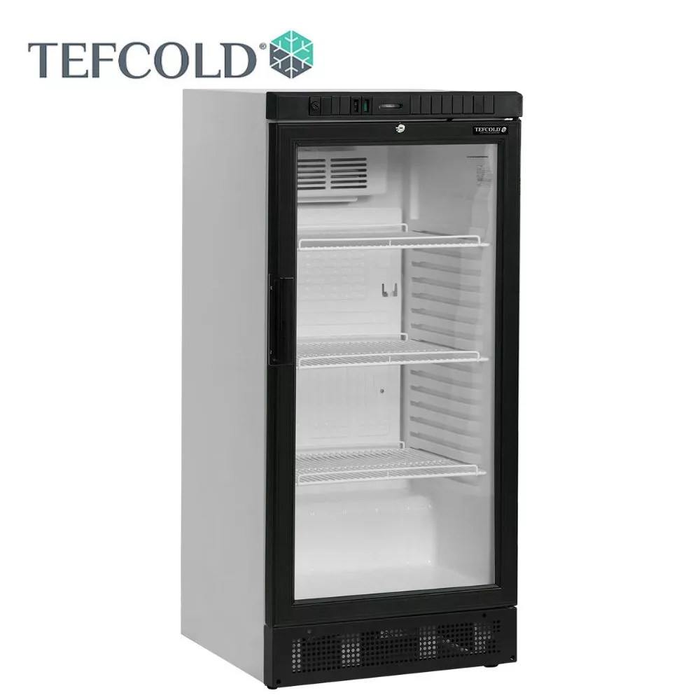 Professzionális hűtővitrin, 215 literes űrtartalommal (Nettó: 190 liter) állítható polcokkal, zárral, megfordítható fekete alumínium keretes üvegajtóval, LED világítással.
