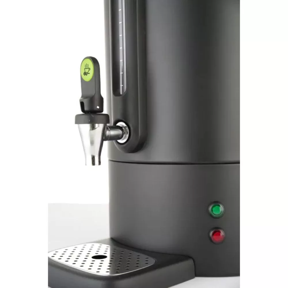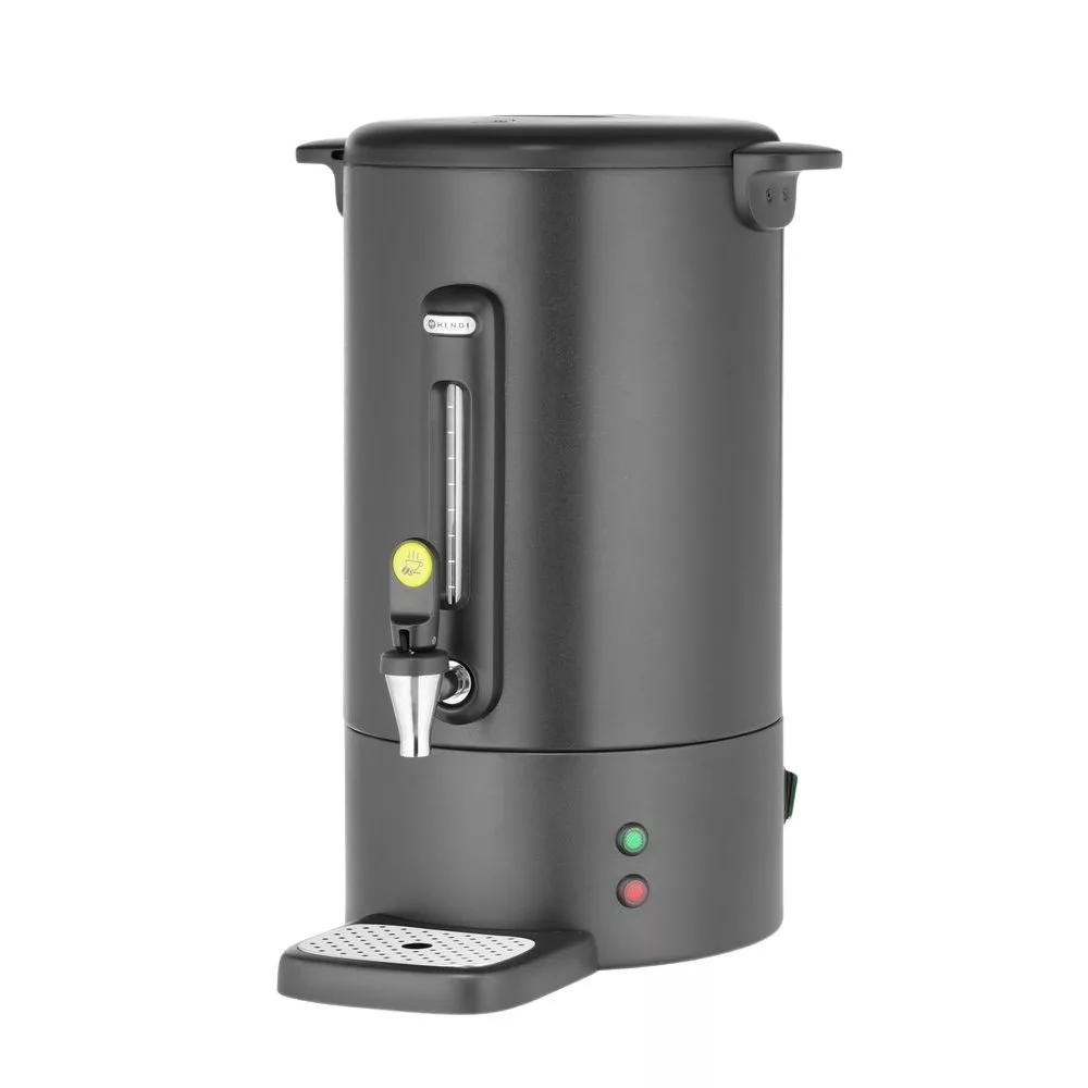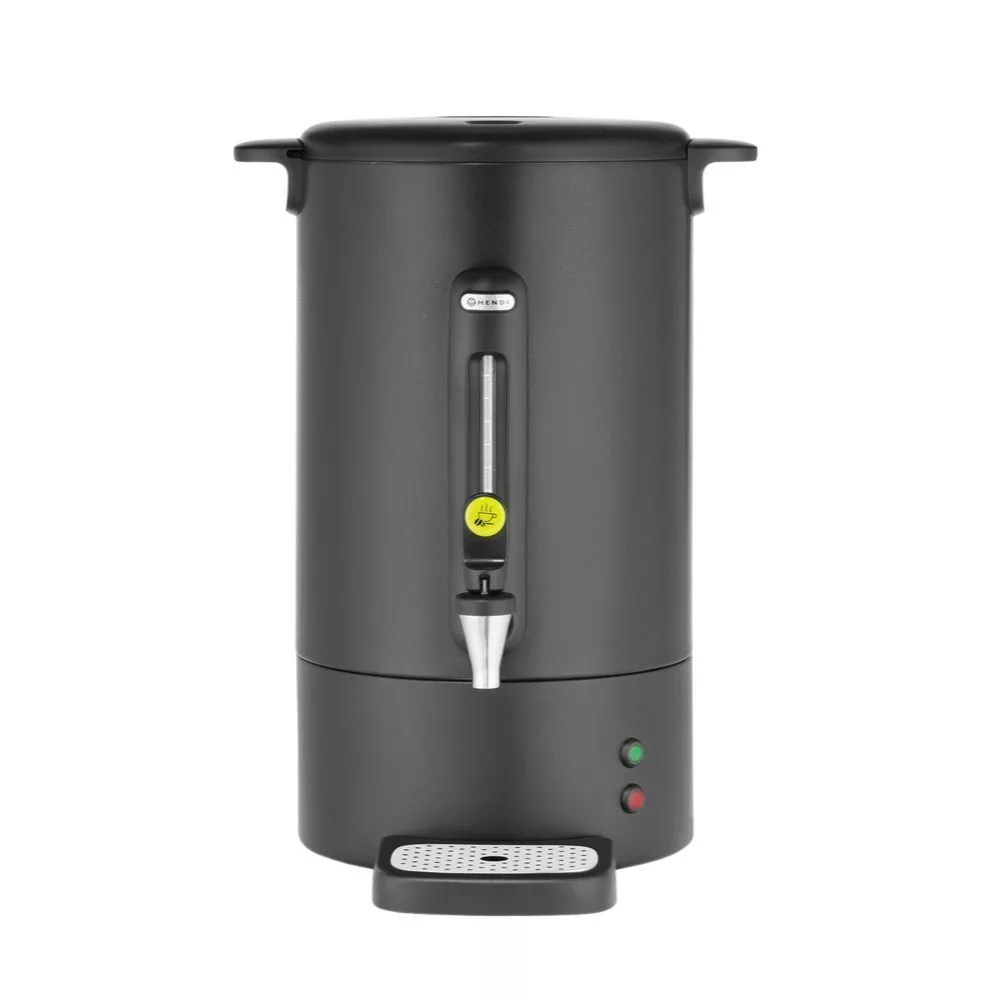 Egy letisztult formavilágú perkolátor, amely a modern svédasztalos és büfé-környezetek elvárásaihoz illeszkedik. Rozsdamentes acél burkolata időtálló és könnyen tisztítható, a fekete kivitel pedig elegáns kontrasztot teremt a vendéglátóhelyek belső terével. A készülék dizájnja nem csupán esztétikai szerepet tölt be: a kialakítás a folyamatos, rendezett kiszolgálást támogatja, így ideális választás reggeli pultokhoz, konferenciákhoz és catering eseményekhez.