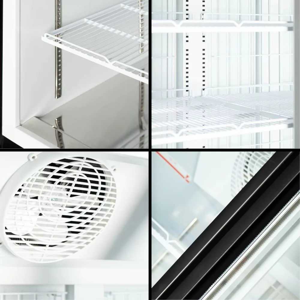 A ventilátoros hűtés lehetővé teszi az állítható polcok használatát, így a vitrin könnyen az aktuális termékkínálathoz igazítható. A hőmérséklet digitális vezérlőn egyszerűen beállítható, a készülék pedig automatikus leolvasztással rendelkezik.