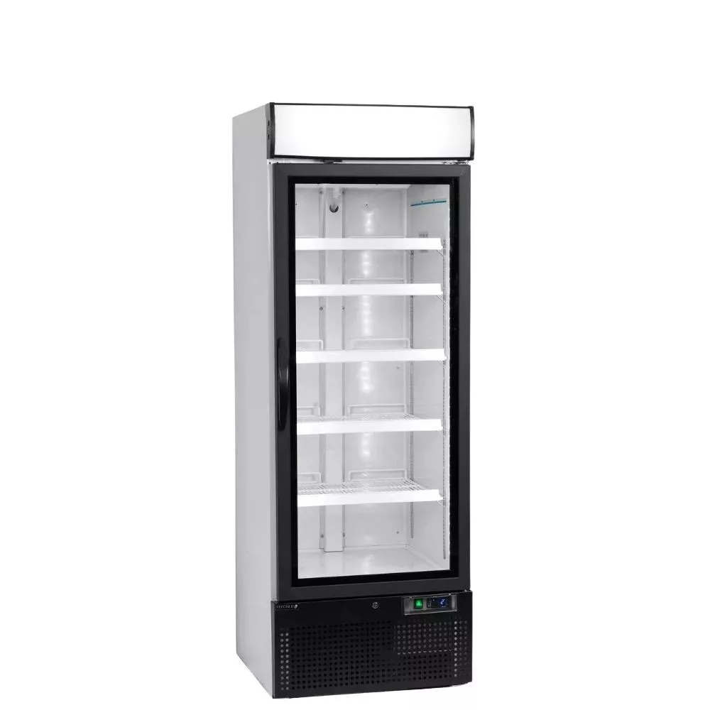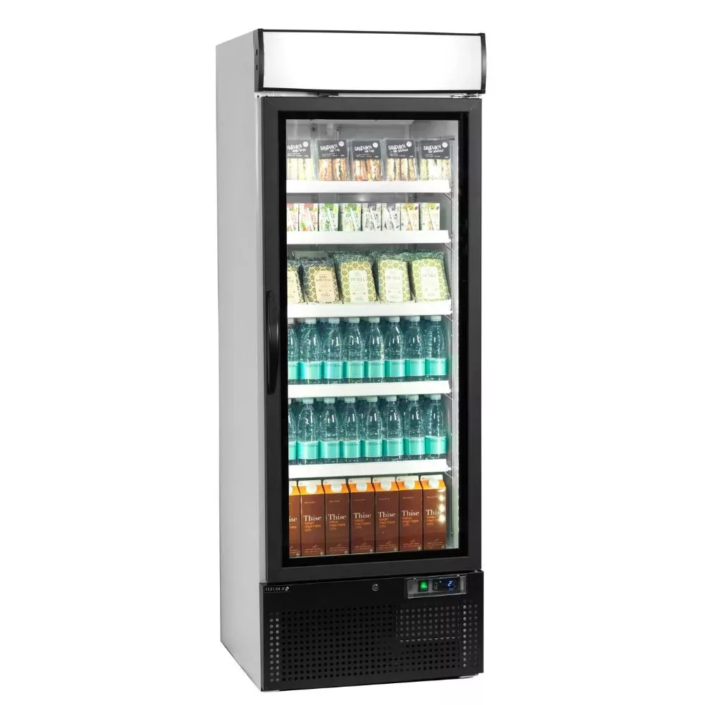 Professzionális üvegajtós hűtővitrin 515 literes űrtartalommal (Nettó: 412 liter), világító hirdető panellel, állítható polcokkal, zárral, LED világítással tökéletes választás olyan üzletek számára, amelyek szűkös helyüket a lehető legjobban szeretnék kihasználni, pl. kávézókba, csemegeboltokba, benzinkutakra.