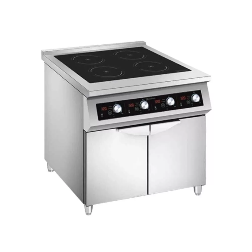 Indukciós tűzhely 4 db 5,0 kW-os főzőzónával (5+5+5+5 kW), zárt szekrényen, rozsdamentes acélból.