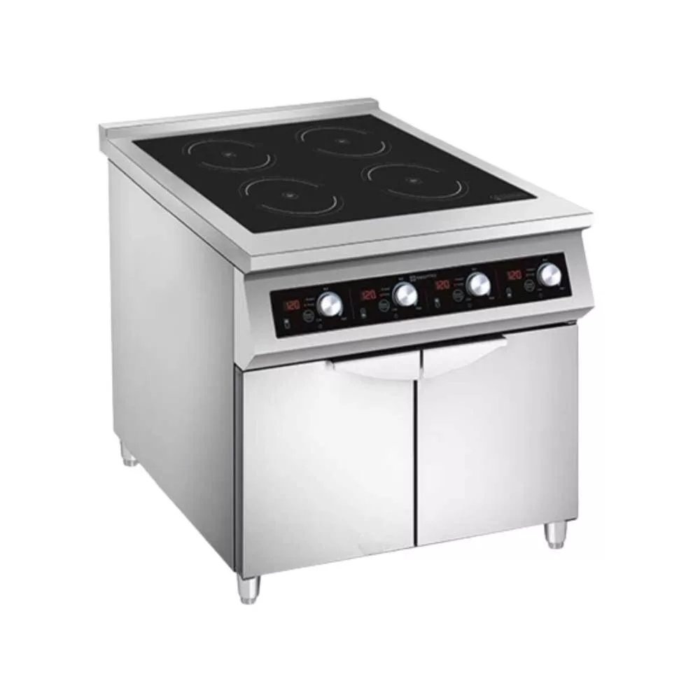 Indukciós tűzhely 4 db 5,0 kW-os főzőzónával, zárt szekrényen, rozsdamentes acélból.