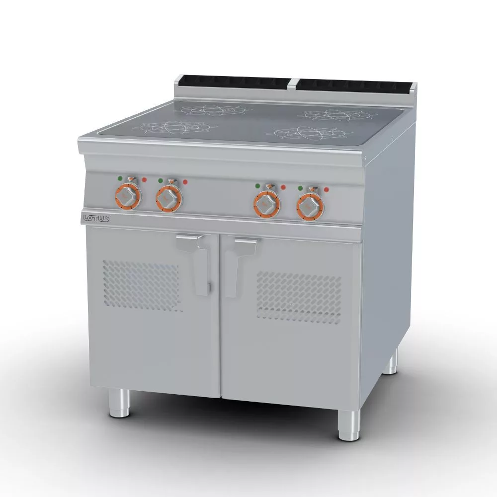 Olaszországban gyártott, rozsdamentes acél kivitelű, elektromos ipari indukciós tűzhely, főzőlap, 4 zónával, 2 mm vastag munkalappal, alsó tárolóval, IPX5 védelemmel. A főzőfelületek üvegkerámiából készültek, a vezérlés tekerőgombbal történik.