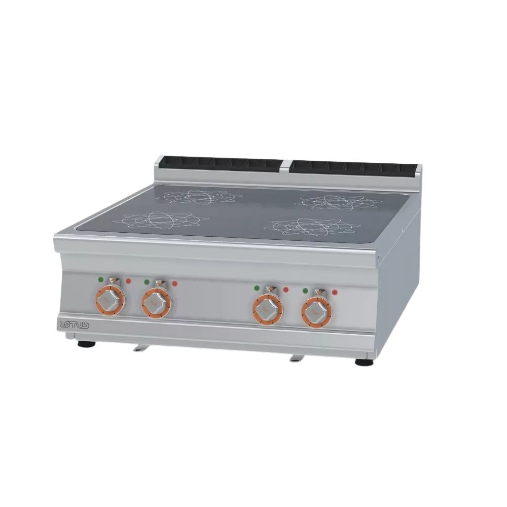 Olaszországban gyártott, rozsdamentes acél kivitelű, elektromos, asztali ipari indukciós tűzhely, főzőlap, 4 zónával, 2 mm vastag munkalappal, IPX5 védelemmel. A főzőfelületek üvegkerámiából készültek, a vezérlés tekerőgombbal történik.