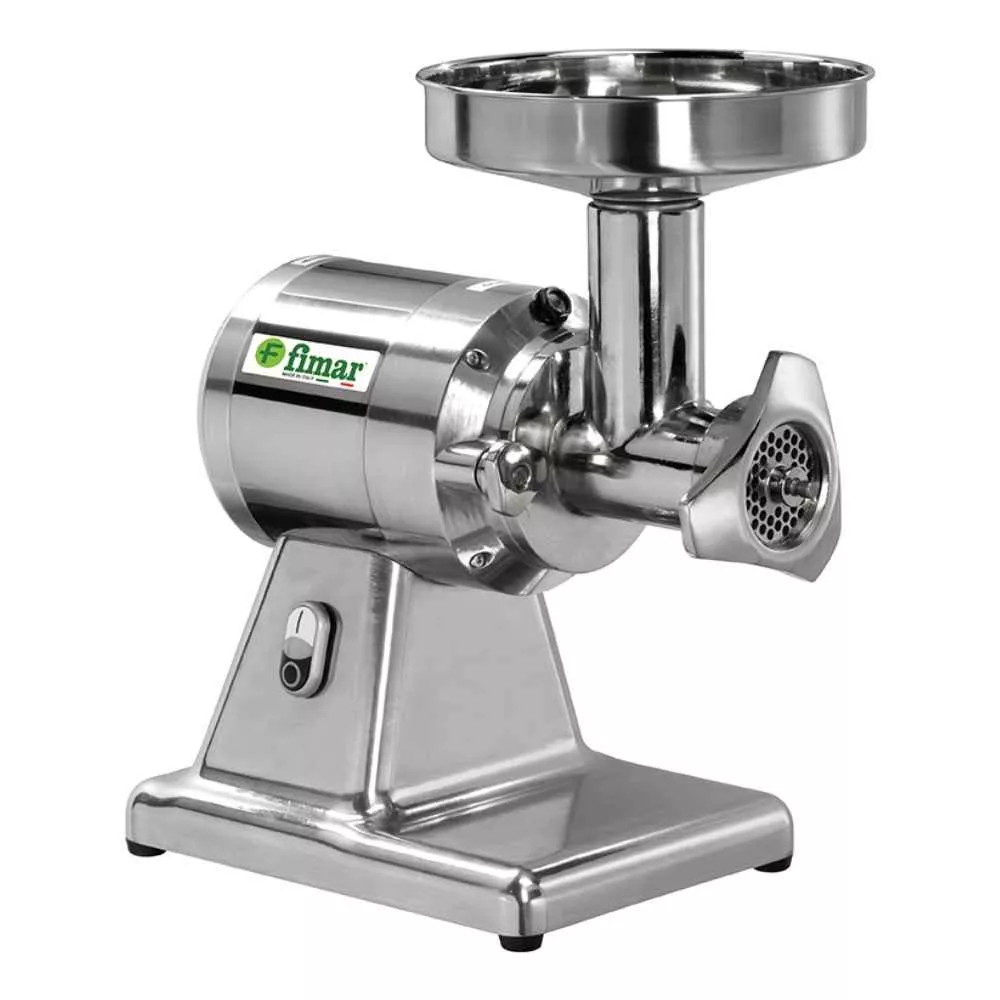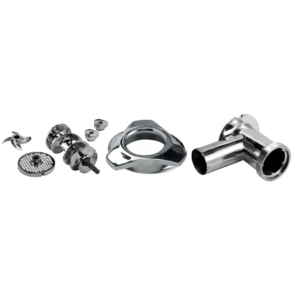 Ipari húsdaráló polírozott alumínium házzal, rozsdamentes acél tálcával és önélező késsel. A garat hossza 12 cm, a betöltőnyílás átmérője 52 mm. Óránként akár 160 kg hús feldolgozásához, leszerelhető darálóegységgel.