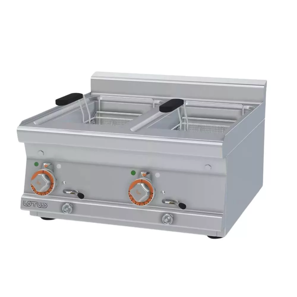 Olaszországban gyártott, elektromos ipari olajsütő, fritőz berendezés, rozsdamentes acélból, asztali kivitelben, 2x10 literes medencével, IPX5 védelemmel.
