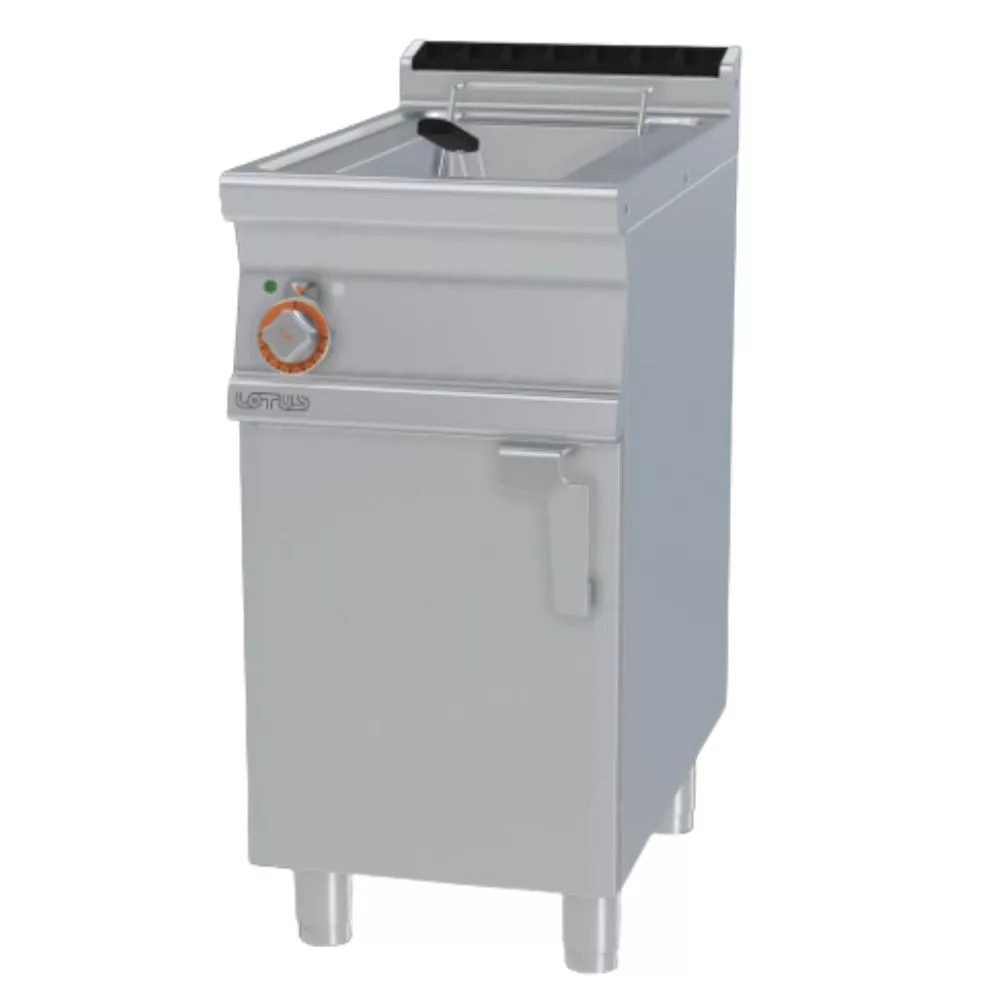 Olaszországban gyártott, háromfázisú, elektromos ipari olajsütő, fritőz berendezés, rozsdamentes acélból, tárolóval, 1x13 literes medencével, IPX5 védelemmel.