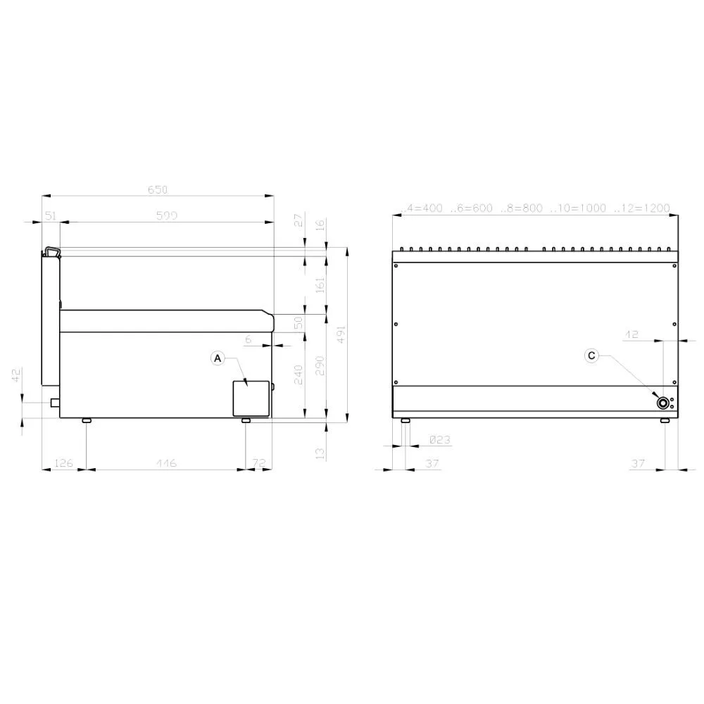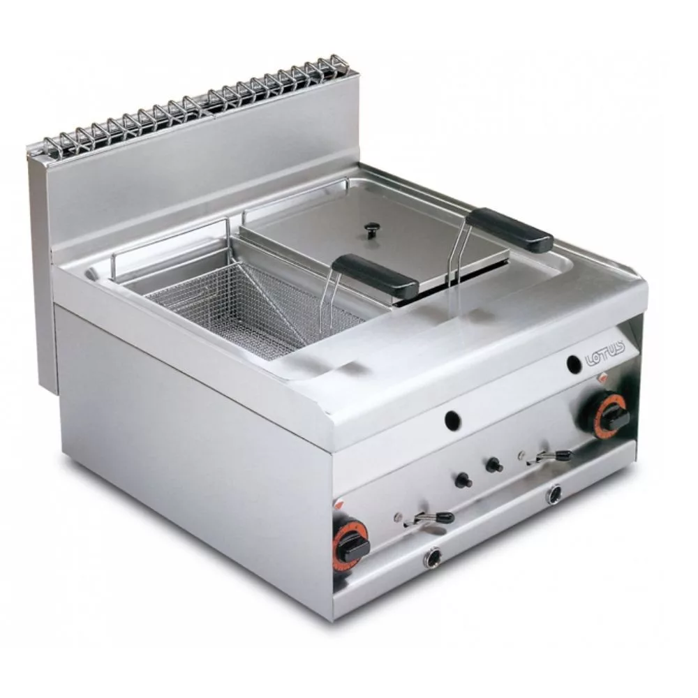 Professzionális gázos olajsütő készülék. A készülék CrNi 18/10 AISI 304 minőségű rozsdamentes acélból készül, ami garantálja a hosszú élettartamot és a kiemelkedő higiéniai szintet. A Scotch-Brite szálcsiszolt felület elegáns megjelenést kölcsönöz, miközben ellenáll a mindennapi használatnak. A 1 mm vastag munkafelület, a lekerekített élek, a krómozott részletek és a hátsó felhajtás professzionális konyhai környezethez lettek tervezve.