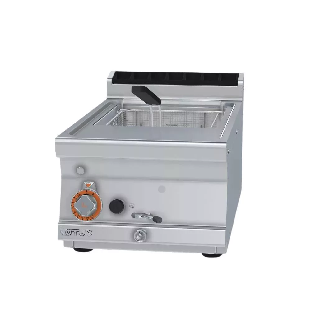 Olaszországban gyártott, gázüzemű ipari olajsütő, fritőz berendezés, rozsdamentes acélból, asztali kivitelben, 1x13 literes medencével, IPX5 védelemmel.