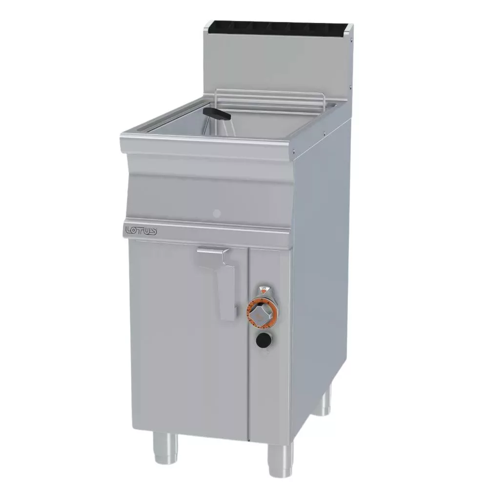 Olaszországban gyártott, gázüzemű ipari olajsütő, fritőz berendezés, rozsdamentes acélból, tárolóval, 1x18 literes medencével, IPX5 védelemmel.