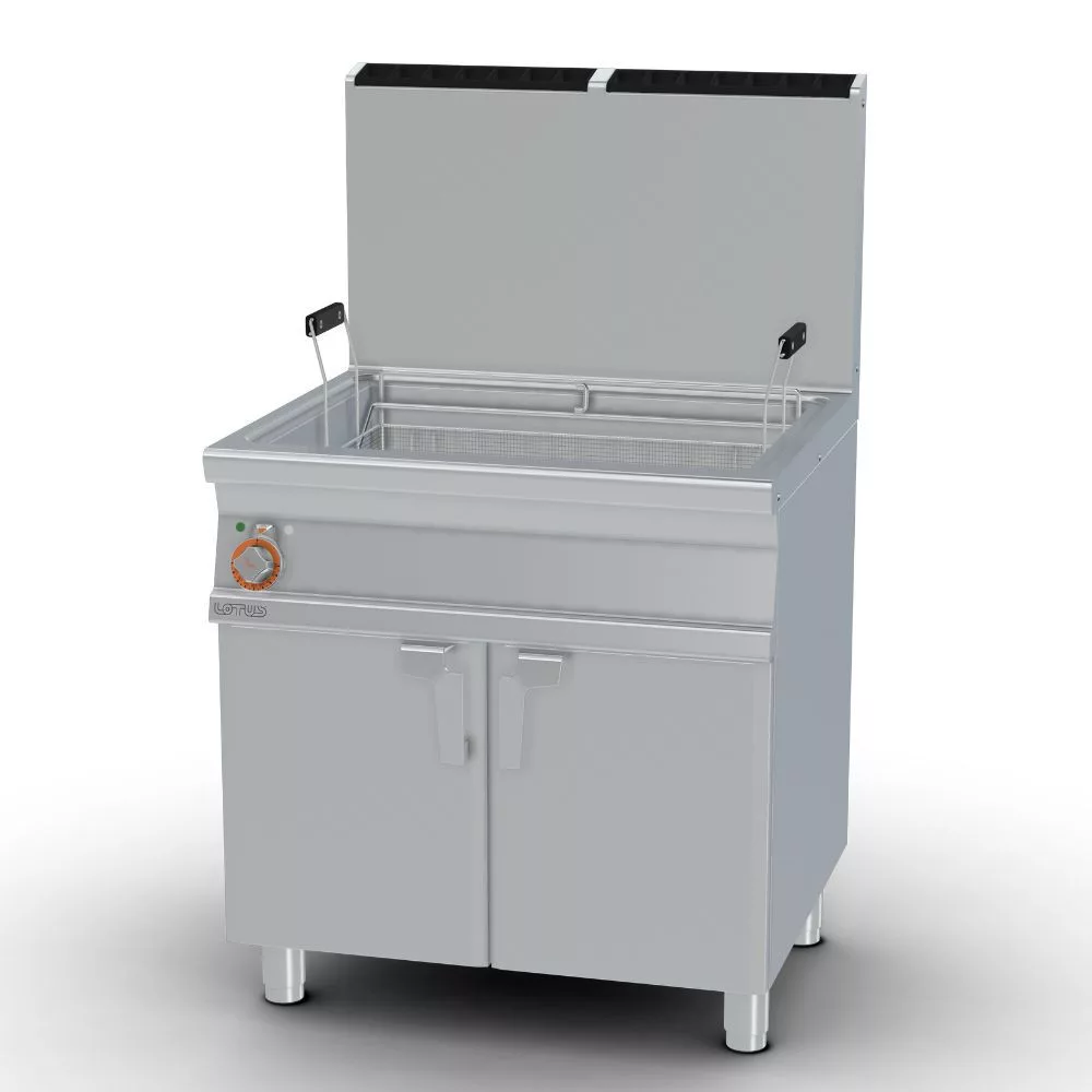 Olaszországban gyártott, gázüzemű ipari olajsütő, fritőz berendezés, rozsdamentes acélból, tárolóval, 1x45 literes medencével, IPX5 védelemmel.