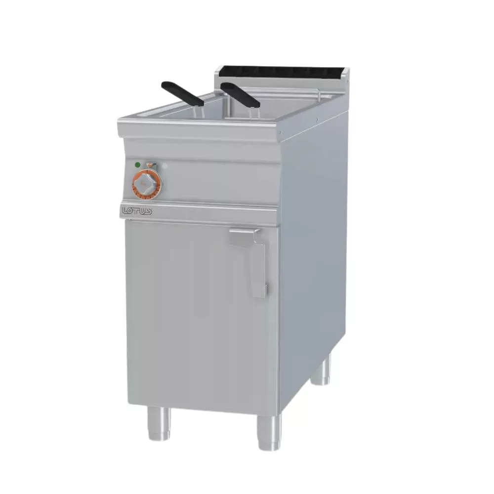 Olaszországban gyártott, gázüzemű ipari olajsütő, fritőz berendezés, rozsdamentes acélból, tárolóval, 1x25 literes medencével, IPX5 védelemmel.