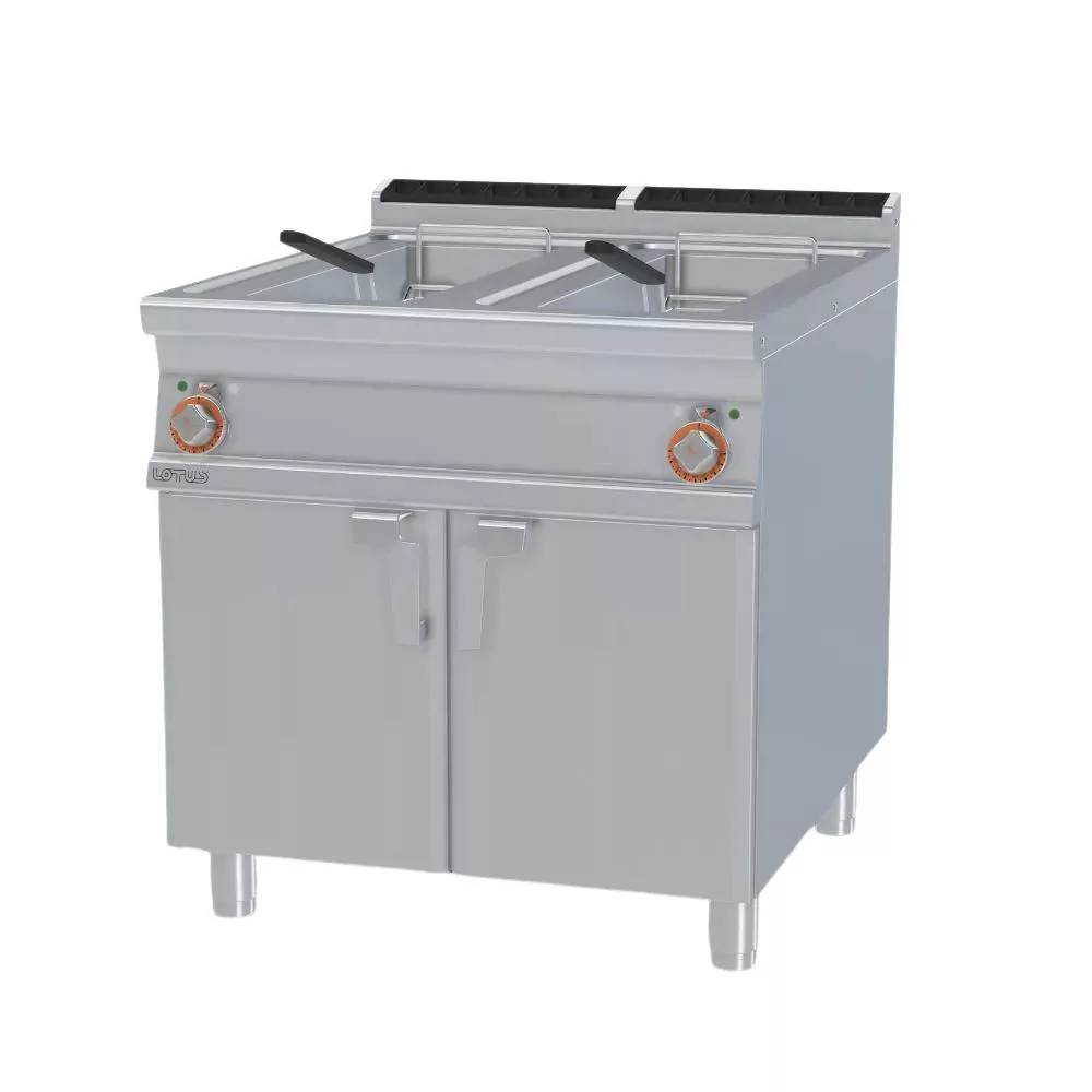 Olaszországban gyártott, gázüzemű ipari olajsütő, fritőz berendezés, rozsdamentes acélból, tárolóval, 2x18 literes medencével, IPX5 védelemmel.