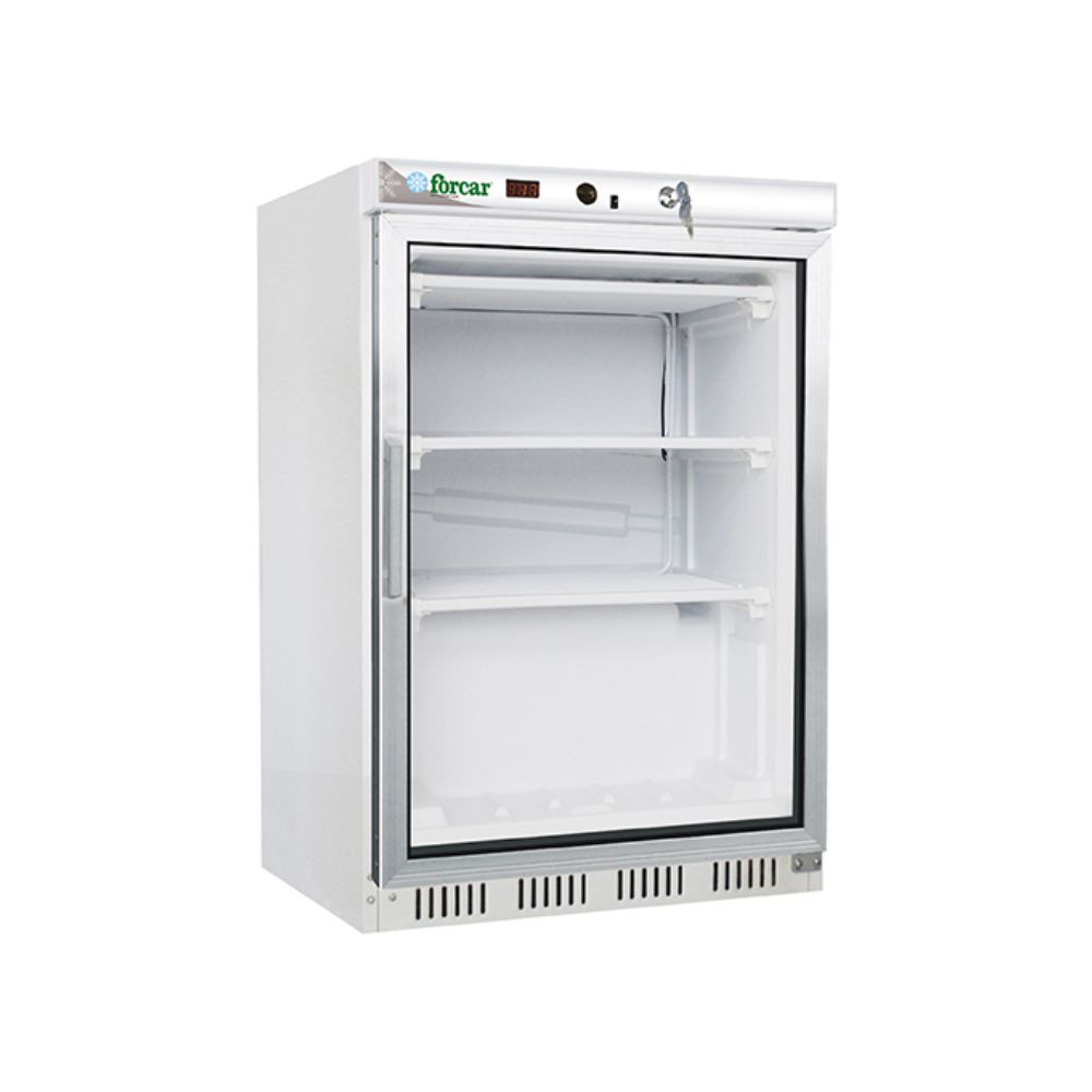 Festett acél burkolatú ipari fagyasztószekrény, bruttó 130 literes űrtartalommal (nettó 63 liter), palásthűtéssel, üvegajtóval.