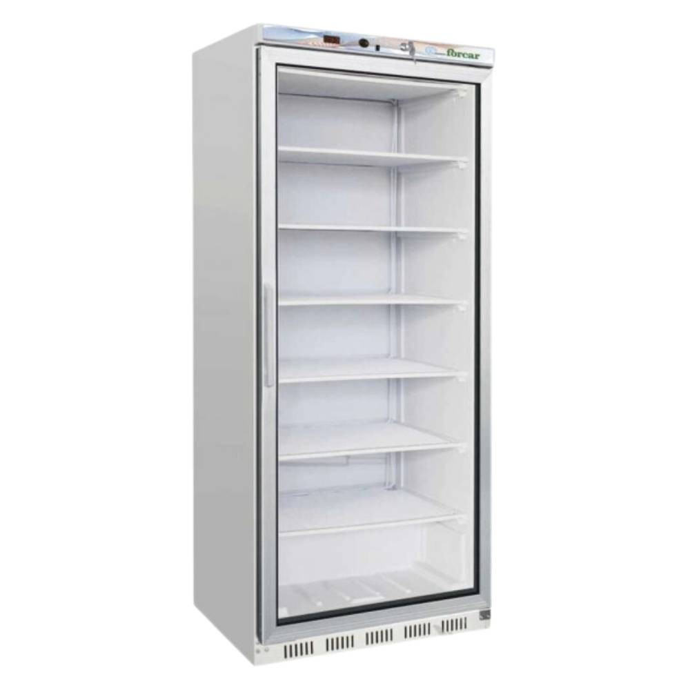 Festett acél burkolatú ipari fagyasztószekrény, 600 literes űrtartalommal (nettó 555 liter), palásthűtéssel, üvegajtóval.
