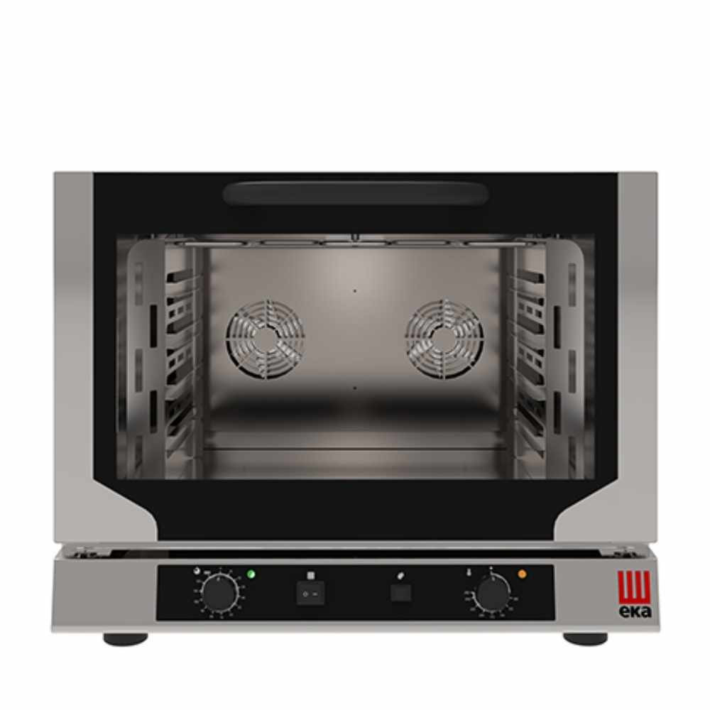 A légkeveréses sütő 4 x GN1/1-es tálcaférőhellyel rendelkezik, a sínek közötti távolság 73 mm. A vezérlés és a gőzbefúvás az alul elhelyezett tekerőgombokkal, manuálisan történik, IPX3 védelemmel ellátott.