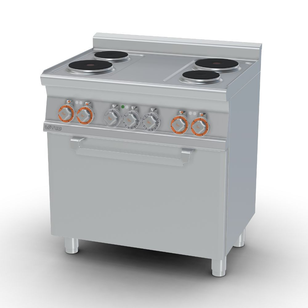 Olaszországban gyártott, rozsdamentes acél kivitelű elektromos ipari tűzhely, 4 zónával, 1 mm vastag munkalappal, elektromos statikus és grill sütővel, IPX5 védelemmel. A körlapos főzőfelületek öntöttvasból készültek, a tekerőgomb 7 pozícióval rendelkezik. Üvegajtóval vagy rozsdamentes acél ajtóval. Sütőrács mérete: GN1/1.
