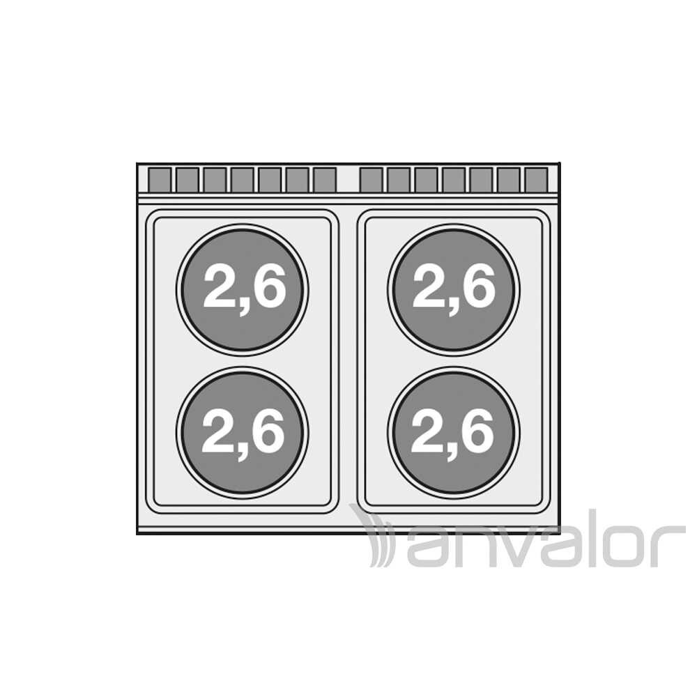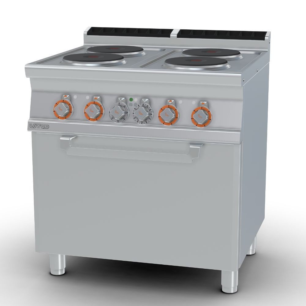 Olaszországban gyártott, rozsdamentes acél kivitelű elektromos ipari tűzhely, 4 zónával, 2 mm vastag munkalappal, légkeveréses sütővel, IPX5 védelemmel. A körlapos főzőfelületek öntöttvasból készültek, a tekerőgomb 7 pozícióval rendelkezik. Sütőrács mérete: GN1/1.