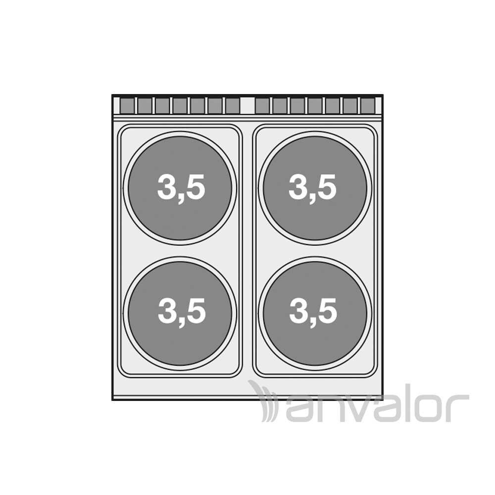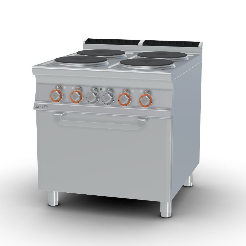 Olaszországban gyártott, rozsdamentes acél kivitelű elektromos ipari tűzhely, 4 zónával, 2 mm vastag munkalappal, légkeveréses sütővel, IPX5 védelemmel. A körlapos főzőfelületek öntöttvasból készültek, a tekerőgomb 7 pozícióval rendelkezik. Sütőrács mérete: GN1/1.