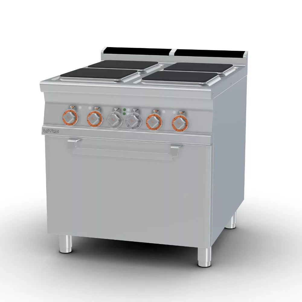 Olaszországban gyártott, rozsdamentes acél kivitelű elektromos ipari tűzhely, 4 zónával, 2 mm vastag munkalappal, statikus sütővel, IPX5 védelemmel. A szögletes főzőfelületek öntöttvasból készültek, a tekerőgomb 7 pozícióval rendelkezik. Sütőrács mérete: GN2/1.