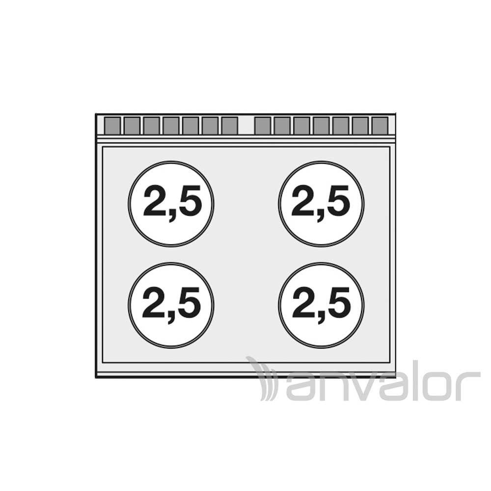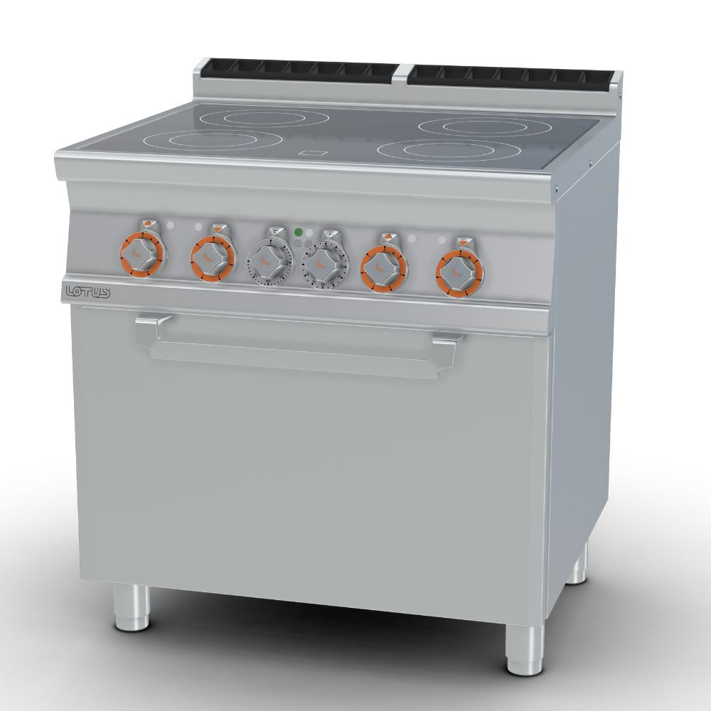 Olaszországban gyártott, rozsdamentes acél kivitelű elektromos ipari tűzhely, 4 zónával, 2 mm vastag munkalappal, üvegkerámia főzőfelülettel, légkeveréses sütővel, IPX5 védelemmel, GN 1/1 sütőrácsmérettel.