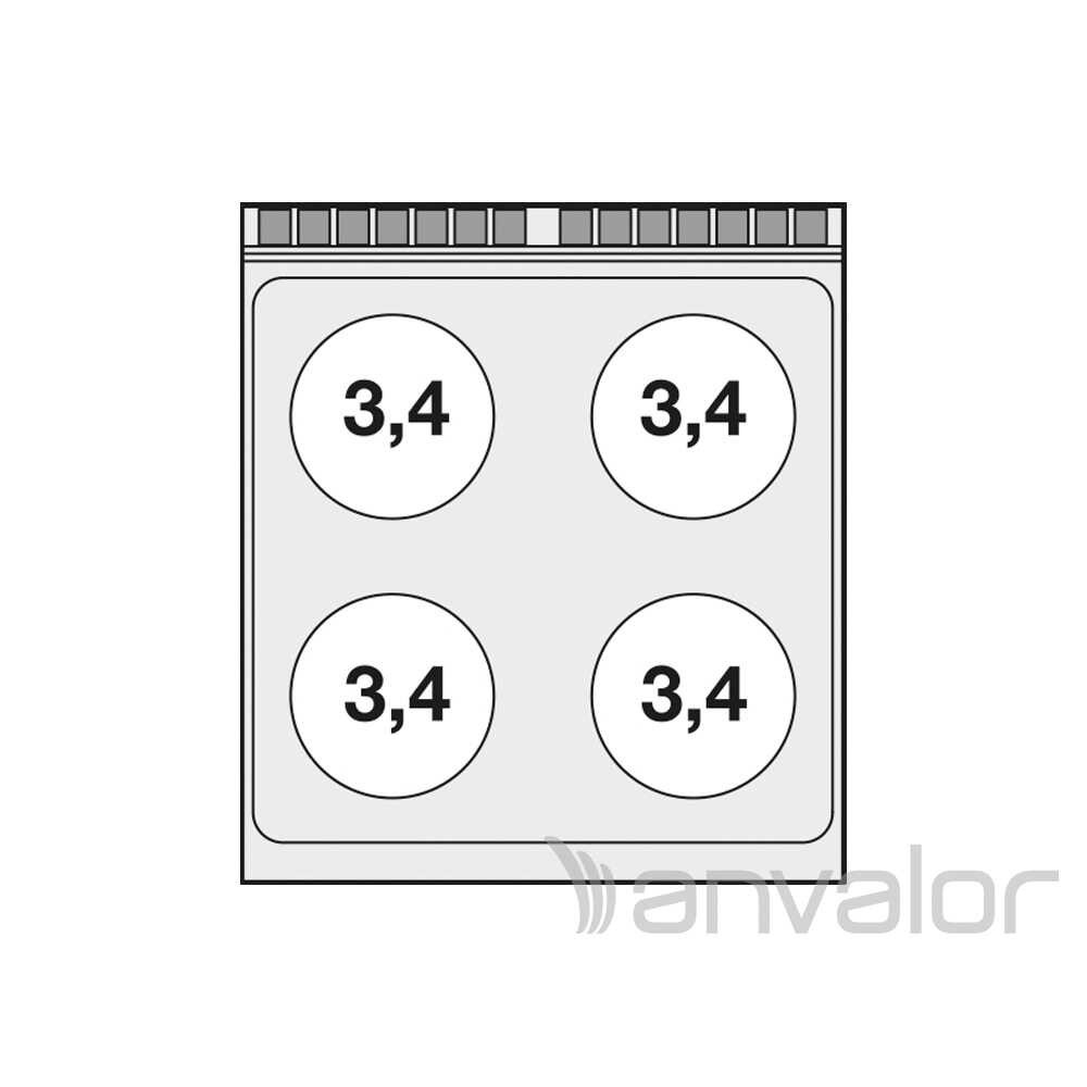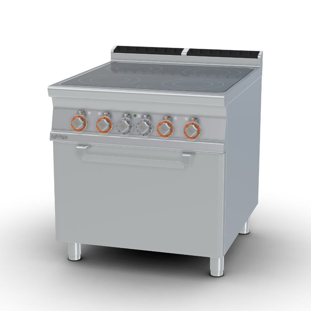 Olaszországban gyártott, rozsdamentes acél kivitelű elektromos ipari tűzhely, 4 zónával, 2 mm vastag munkalappal, üvegkerámia főzőfelülettel, légkeveréses sütővel, IPX5 védelemmel, GN 1/1 sütőrácsmérettel.