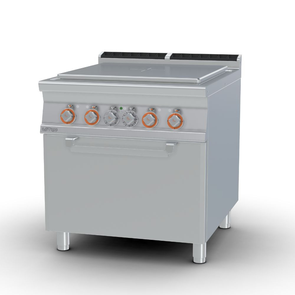 Olaszországban gyártott, rozsdamentes acél kivitelű, elektromos, ipari tűzhely, főzőlap, 2 mm vastag munkalappal, elektromos légkeveréses sütővel, IPX5 védelemmel. Sütőrács mérete: GN1/1. A főzőfelület 4 zónás francia lap.