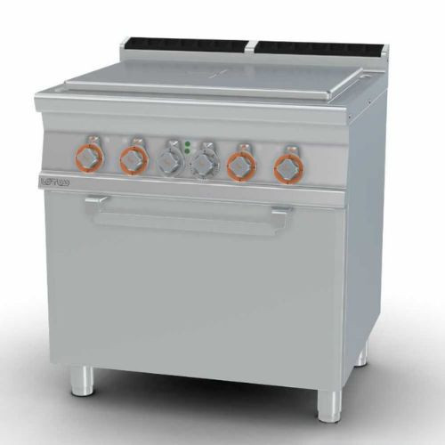 Olaszországban gyártott, rozsdamentes acél kivitelű, elektromos, ipari tűzhely, főzőlap, 2 mm vastag munkalappal, elektromos statikus sütővel, IPX5 védelemmel. Sütőrács mérete: GN2/1. A főzőfelület 4 zónás francia lap.