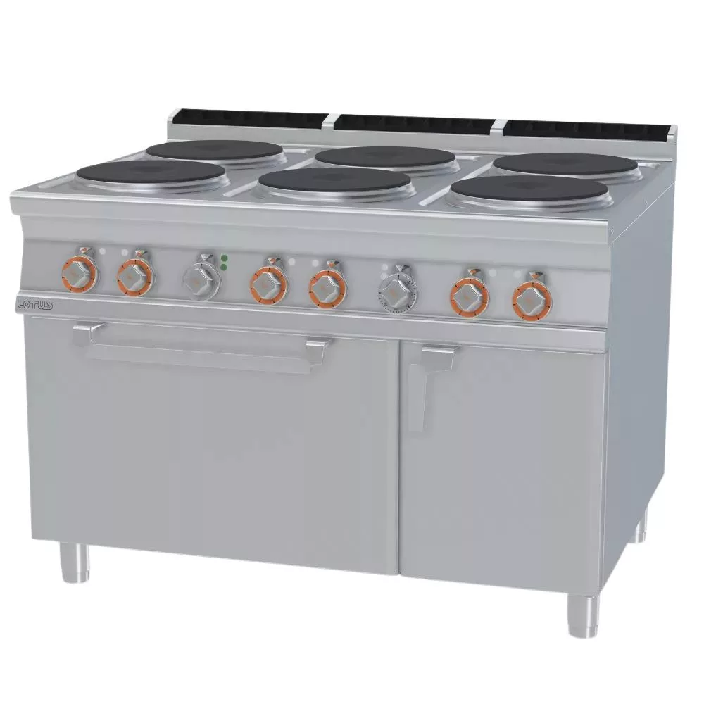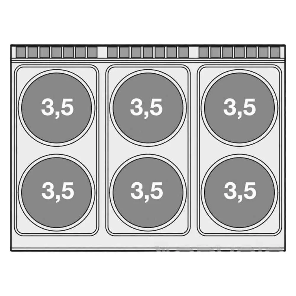 Olaszországban gyártott, rozsdamentes acél kivitelű elektromos ipari tűzhely, 6 zónával, 2 mm vastag munkalappal, elektromos statikus sütővel, tárolóval, IPX5 védelemmel. A körlapos főzőfelületek öntöttvasból készültek, a tekerőgomb 7 pozícióval rendelkezik. Sütőrács mérete: GN2/1.